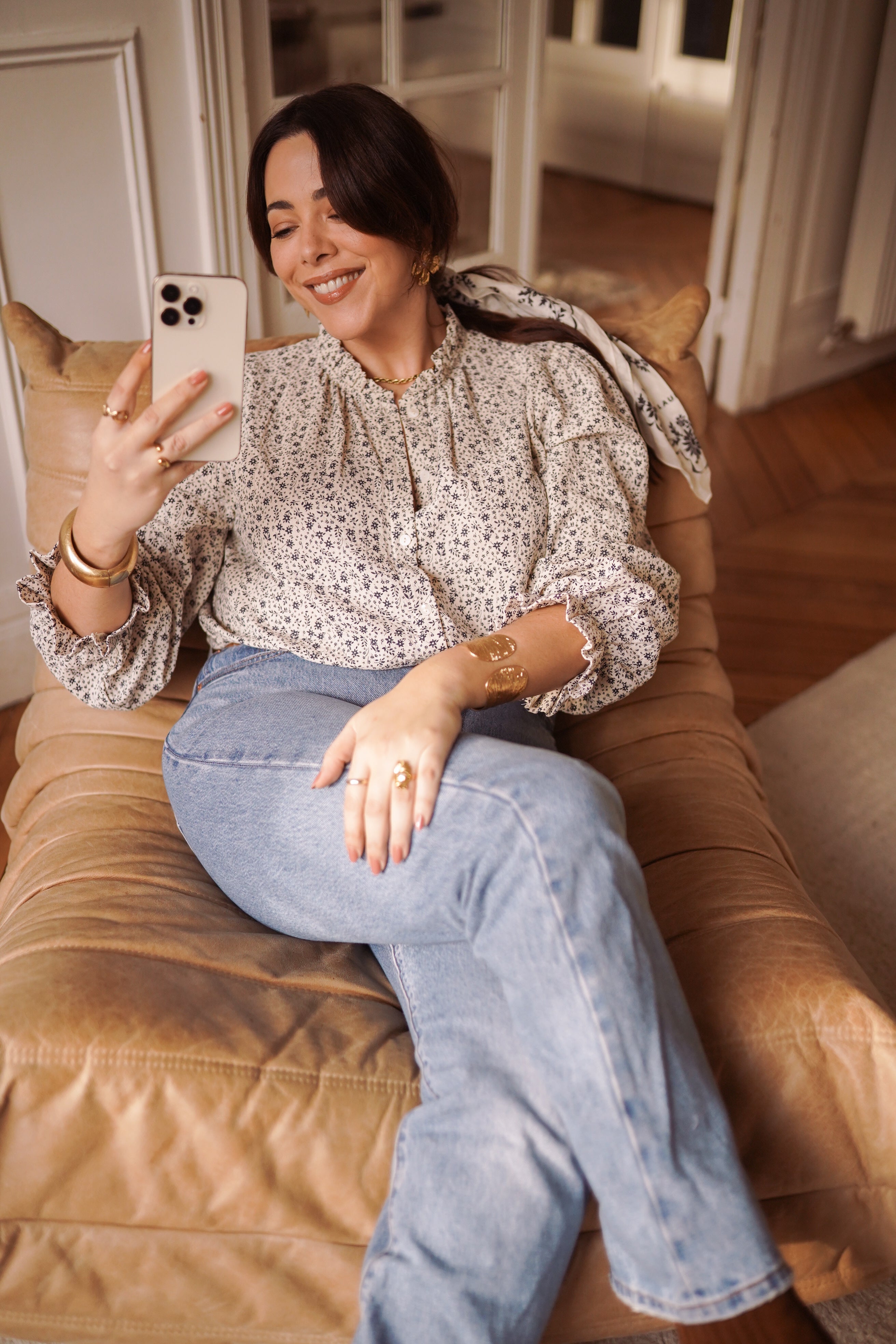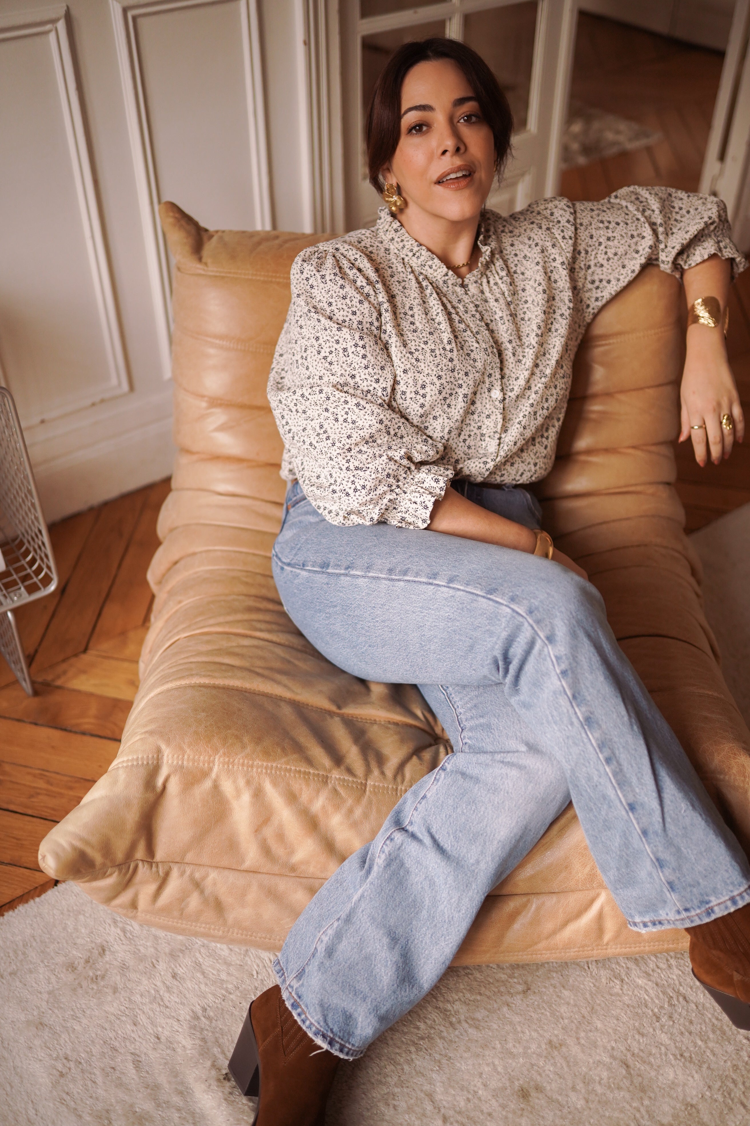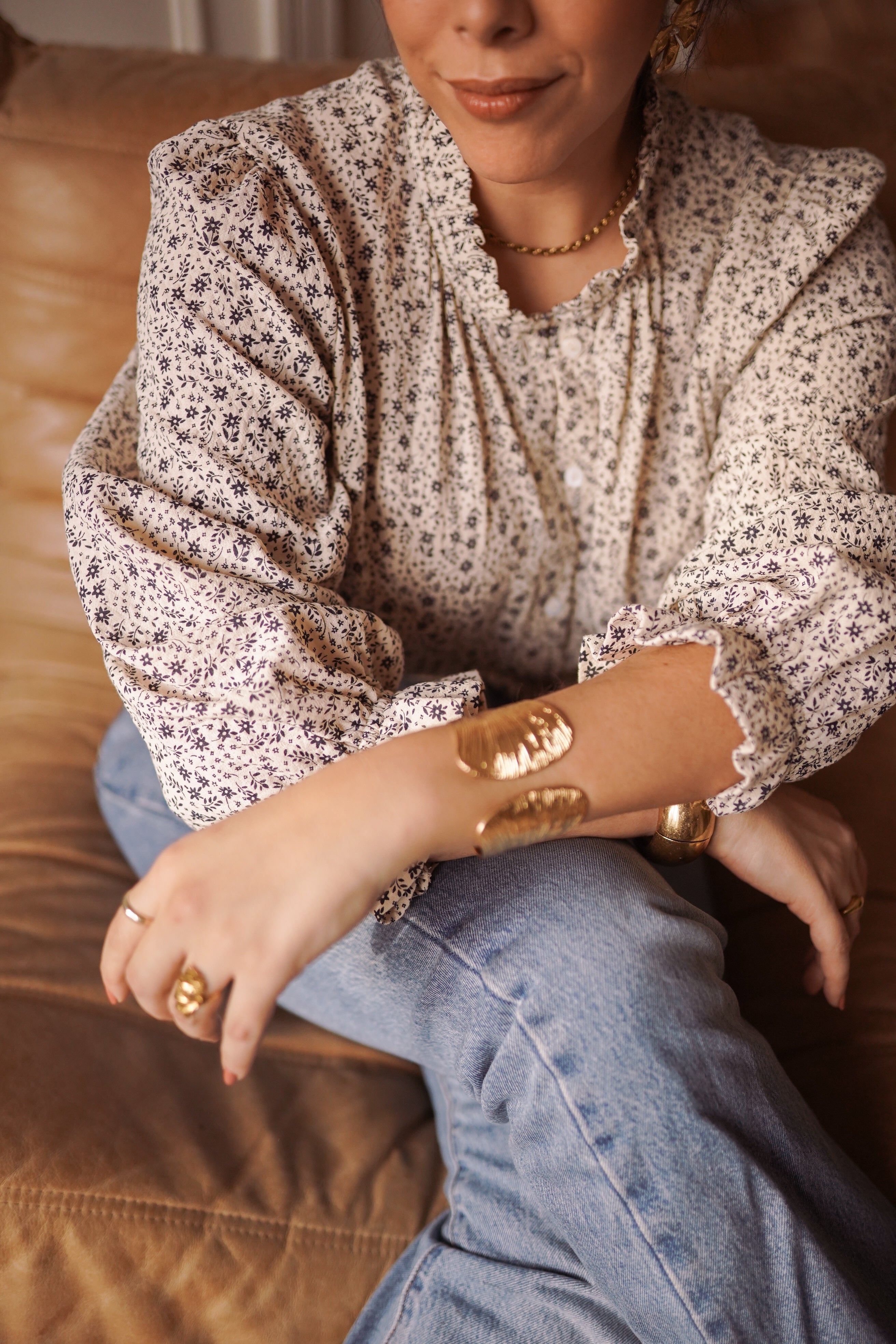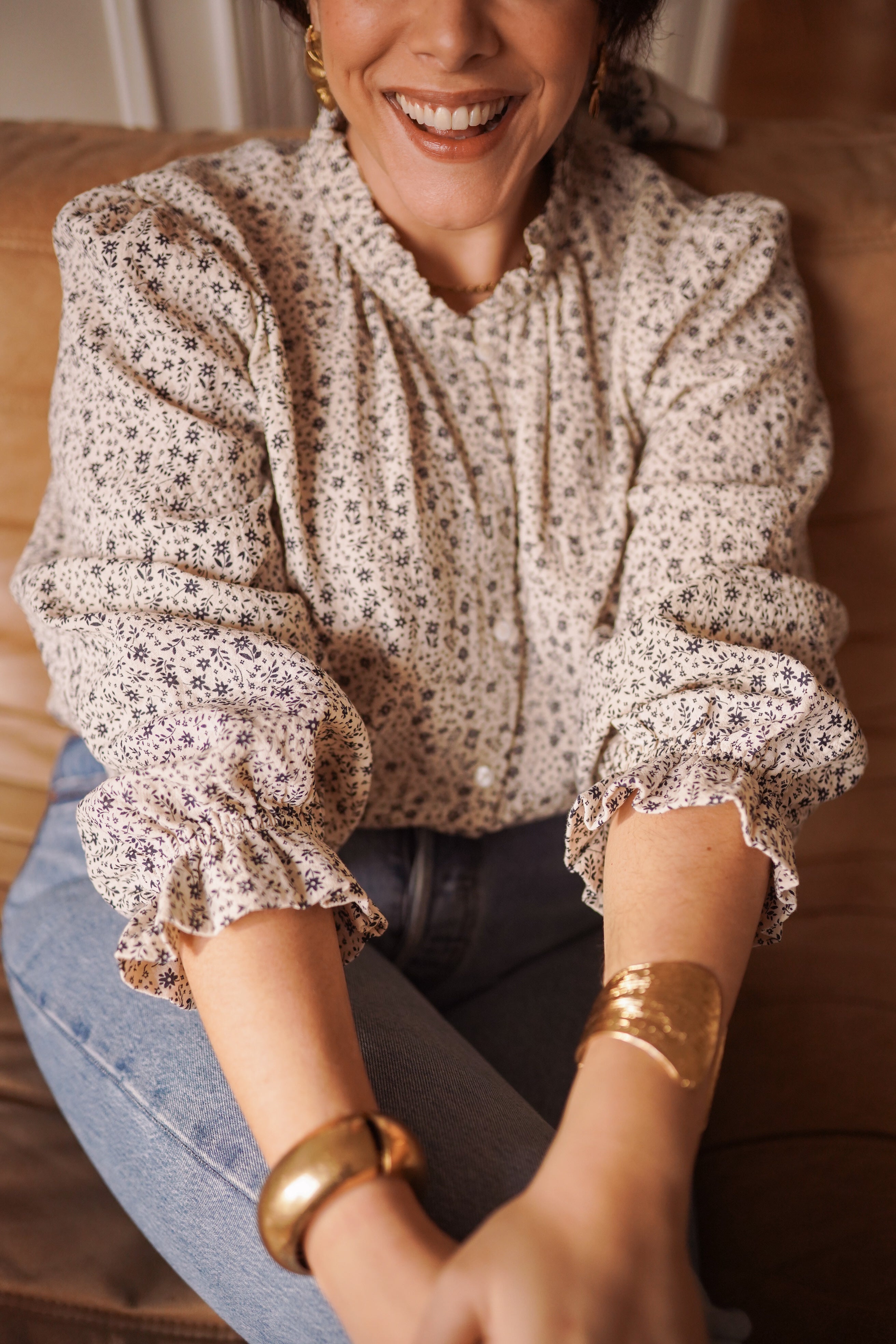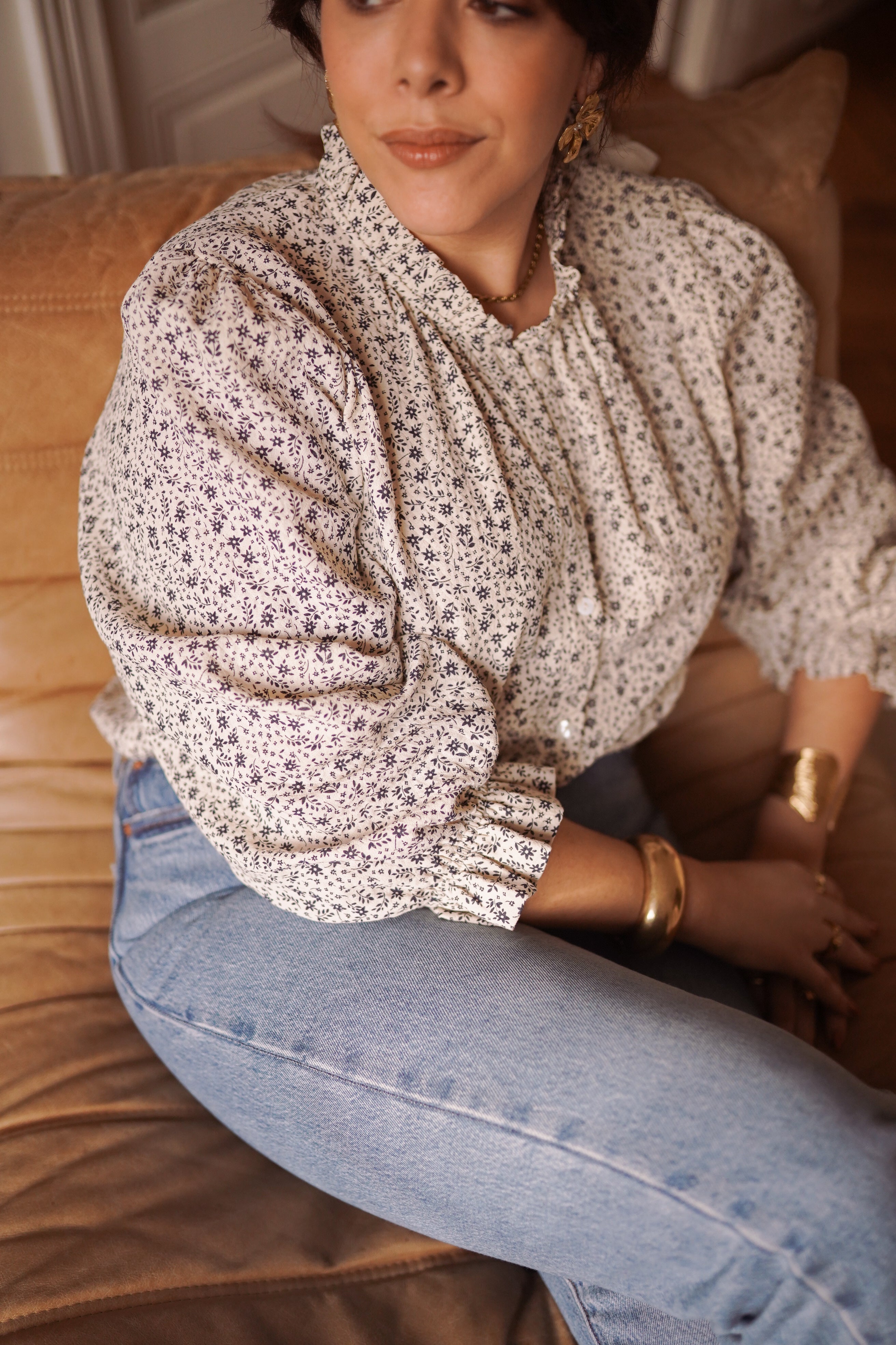 - Manches longues légèrement bouffantes, resserrées aux poignets.