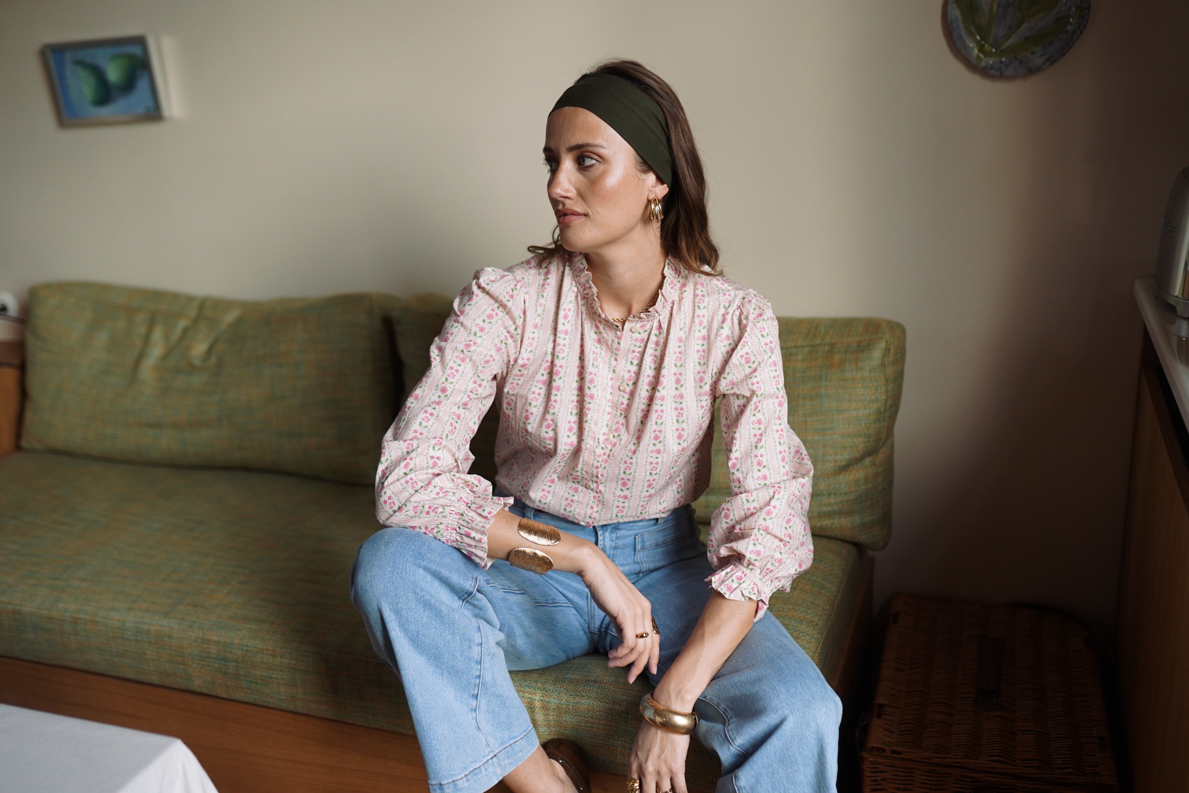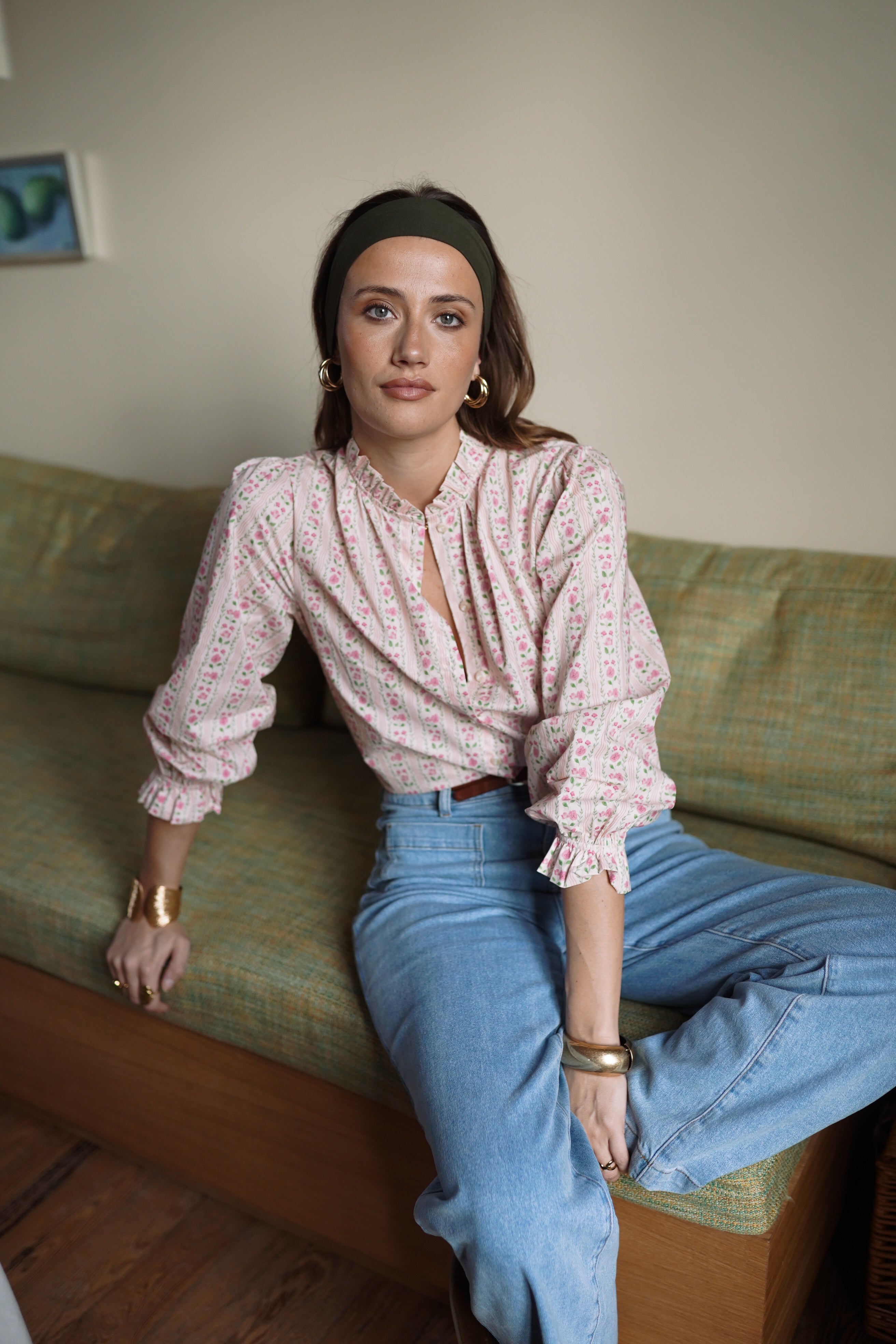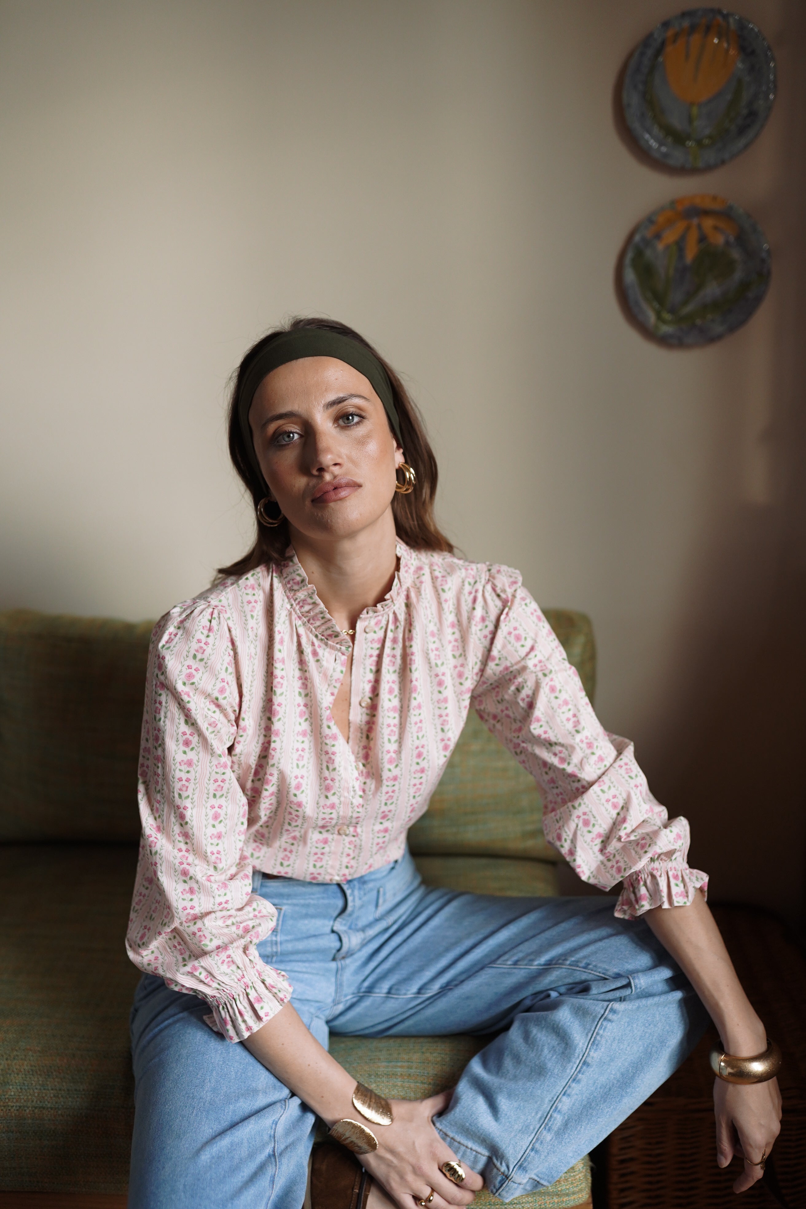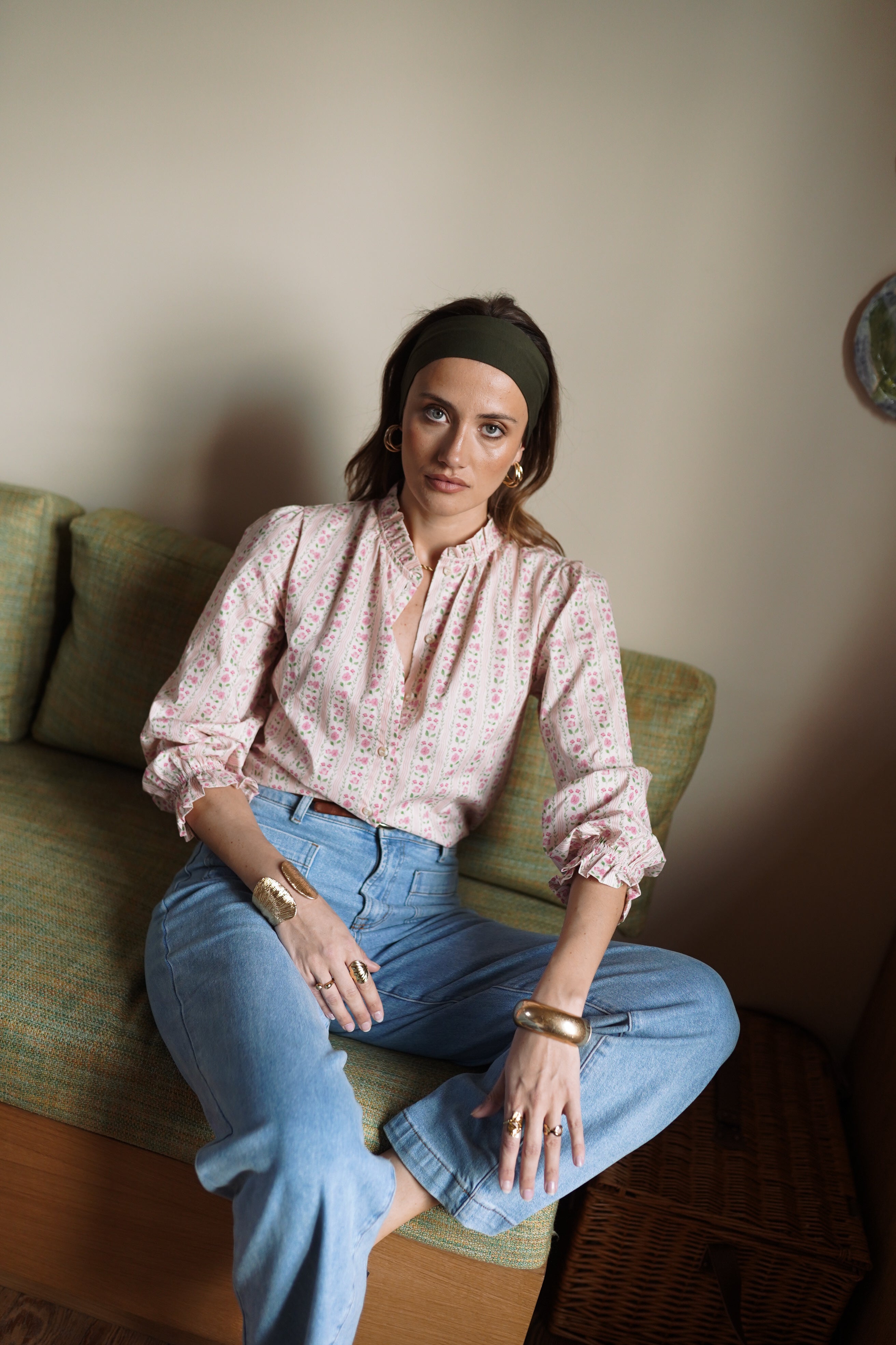 Basile affirme un imprimé floral délicat sur une base rose poudré. Une chemise légère, au tombé souple, pensée pour marquer la silhouette et s’imposer comme une pièce forte du vestiaire.