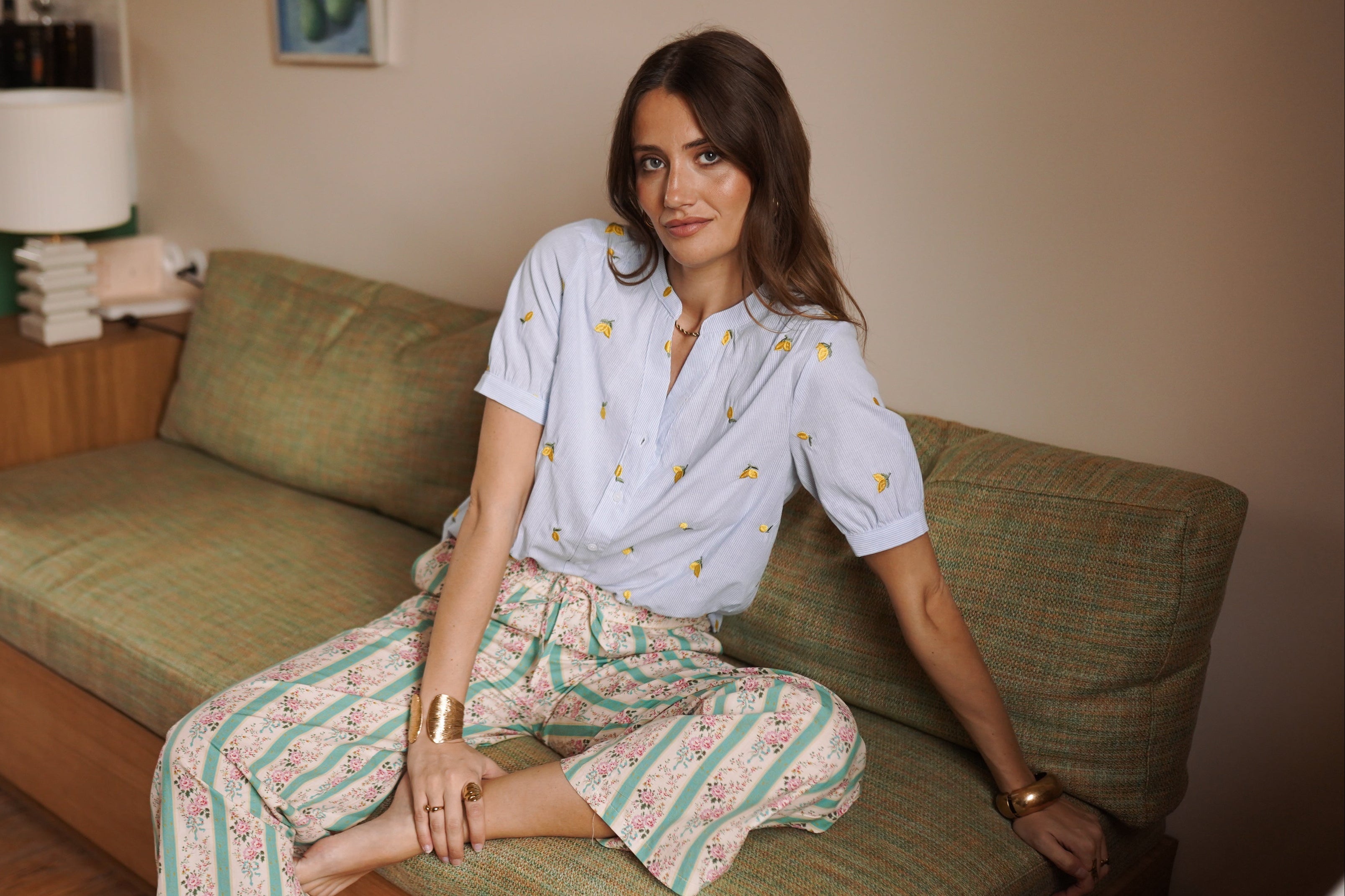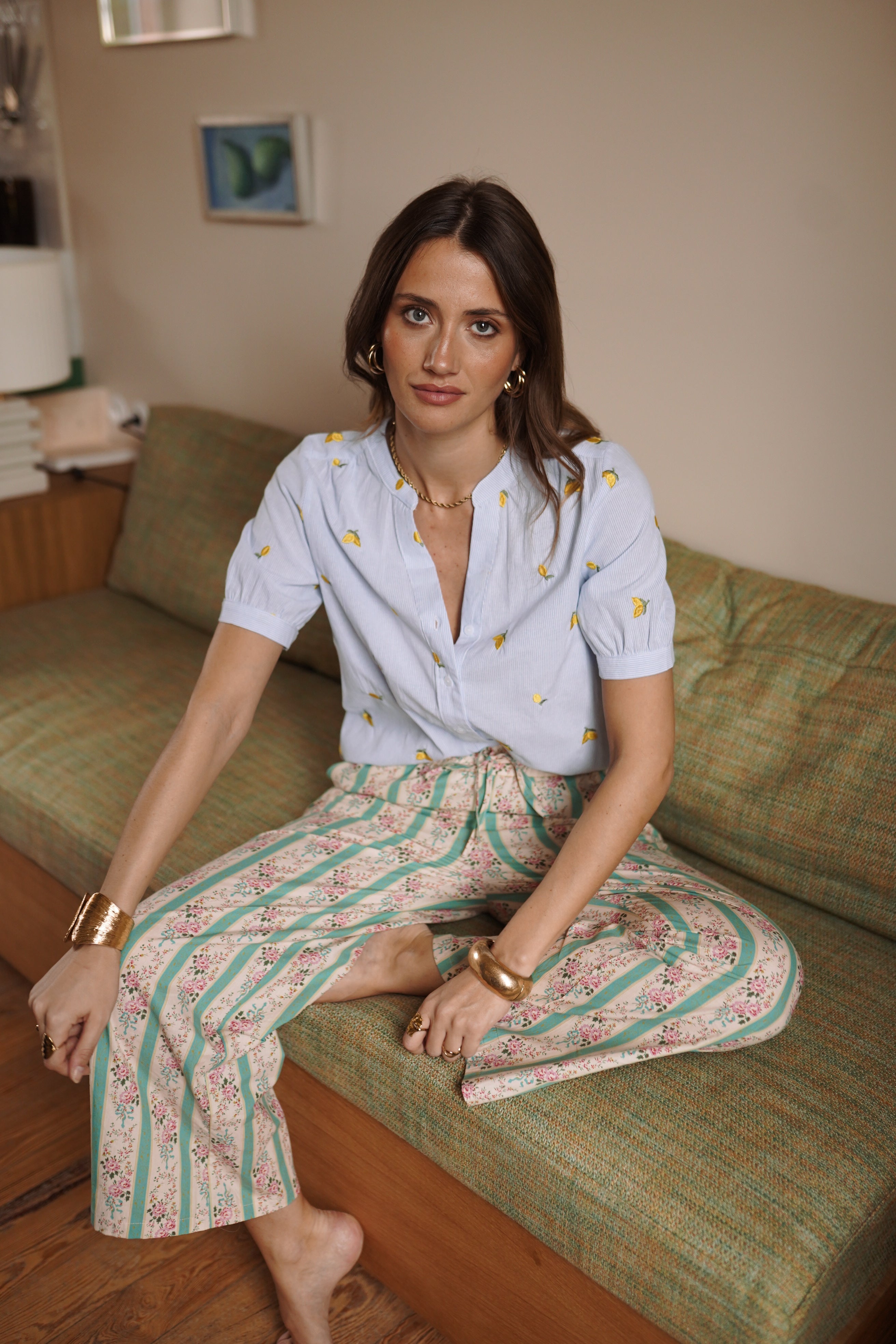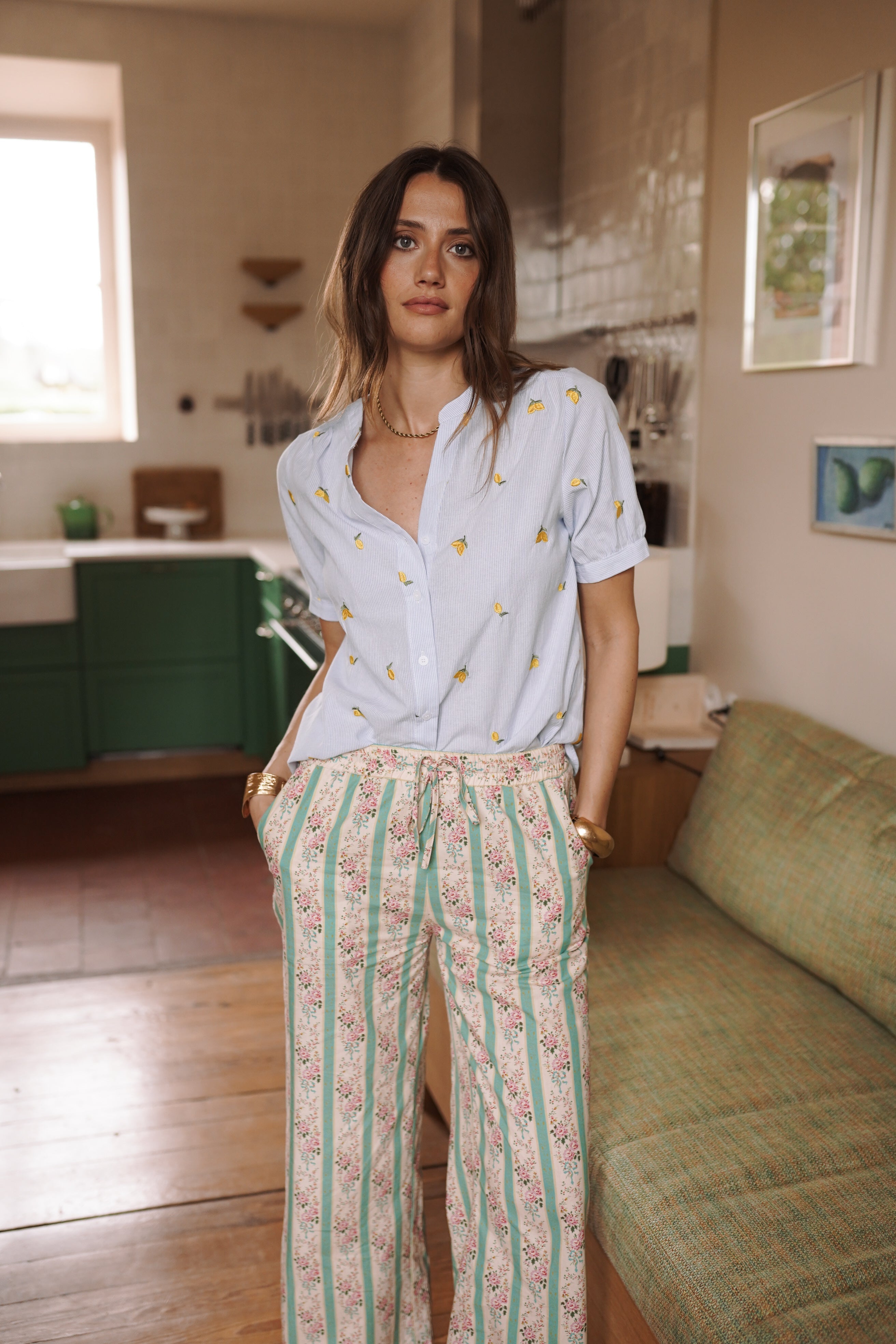 Citrus apporte une fraîcheur immédiate au vestiaire. Une chemise légère à fines rayures, ponctuée de broderies citron qui donnent du relief et une touche solaire au look.