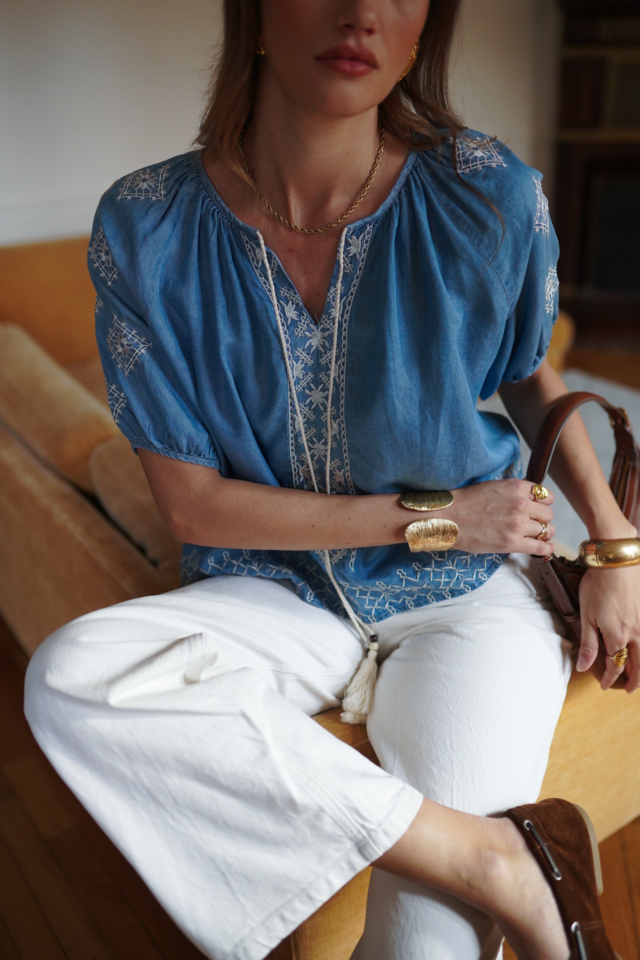 - Encolure fendue soulignée de broderies délicates