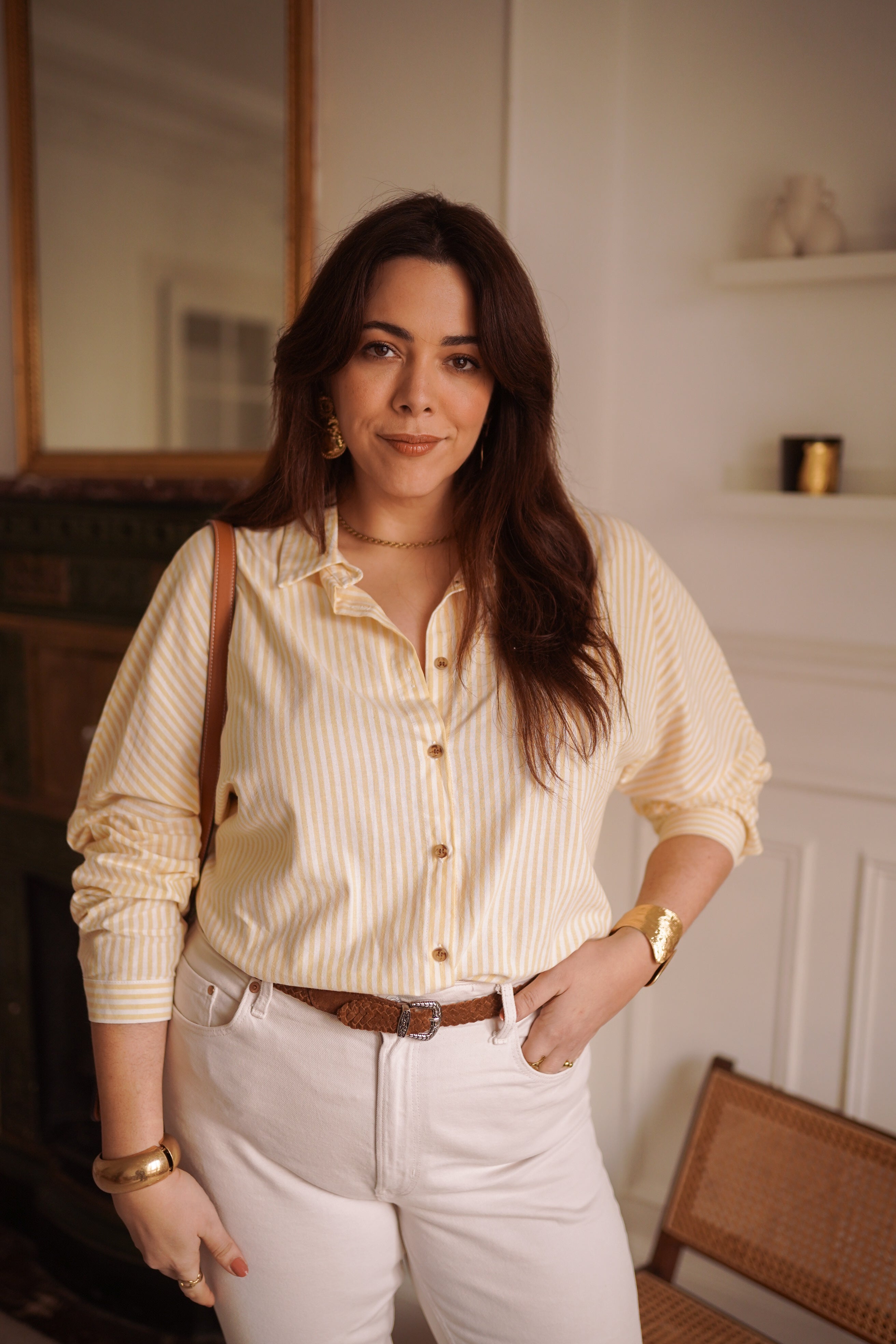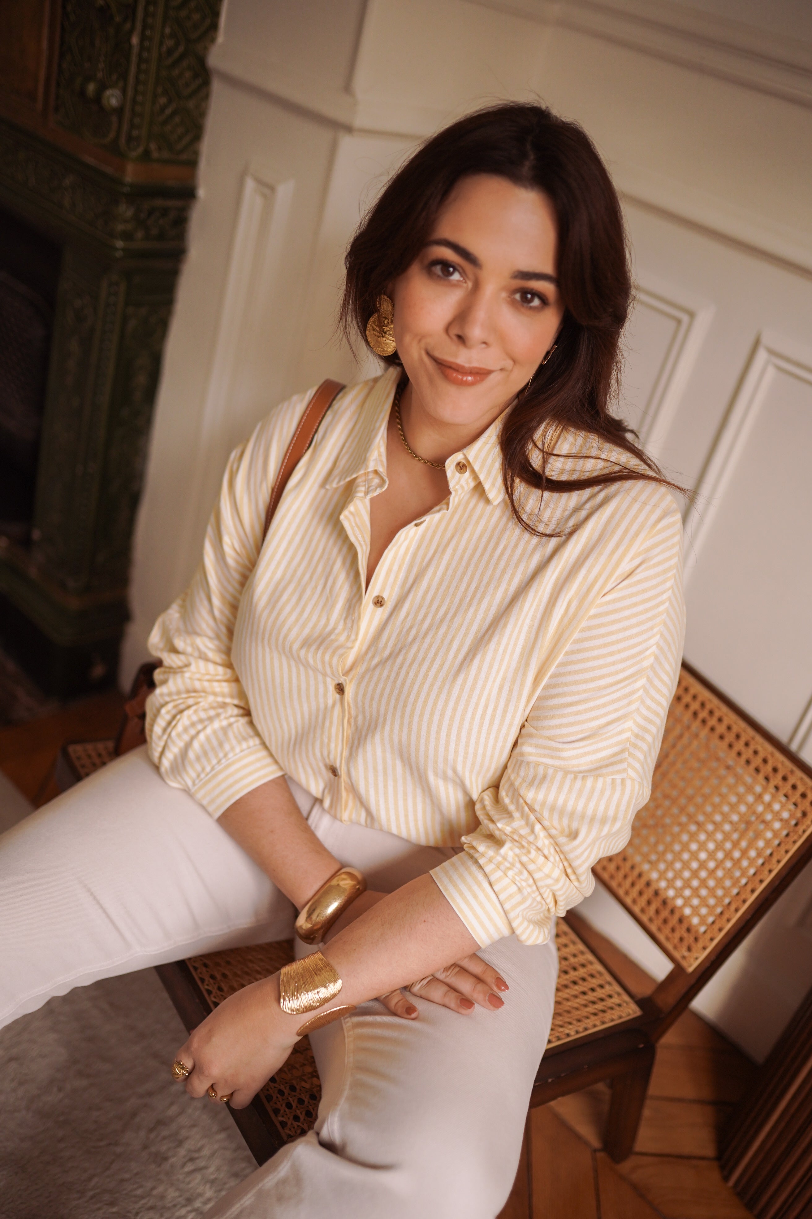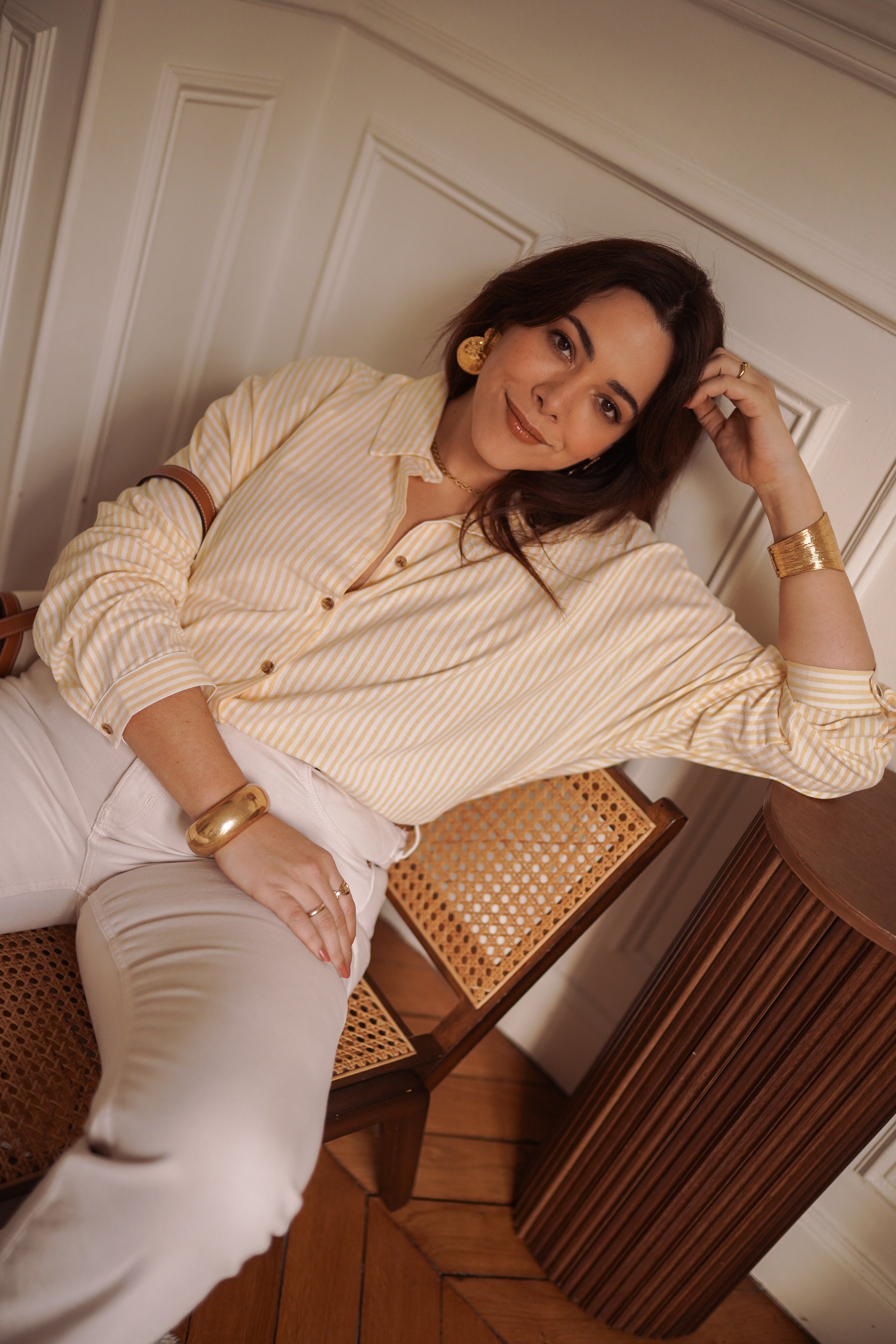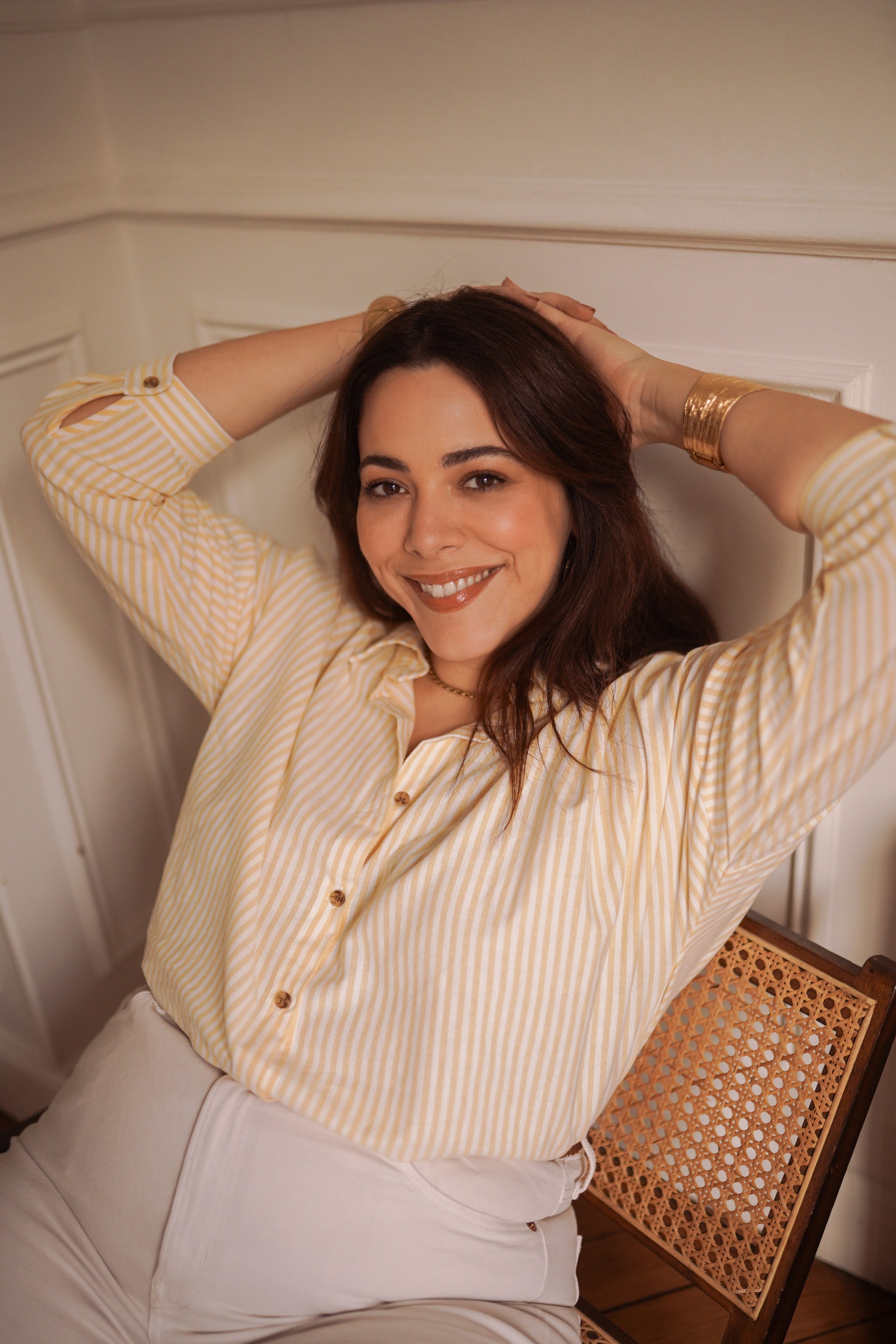 - Rayures fines jaune doux et écru, lumineuses et faciles à associer