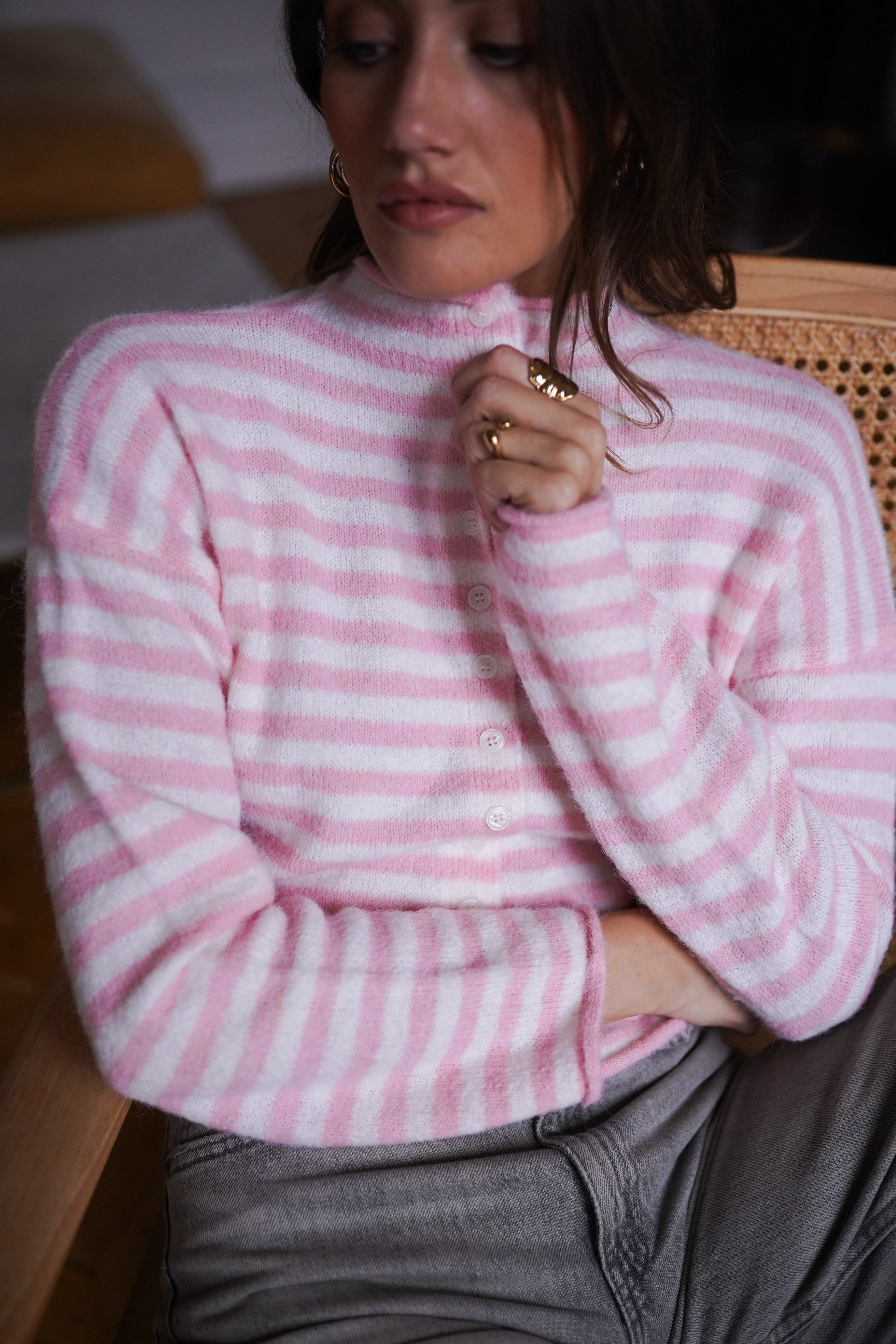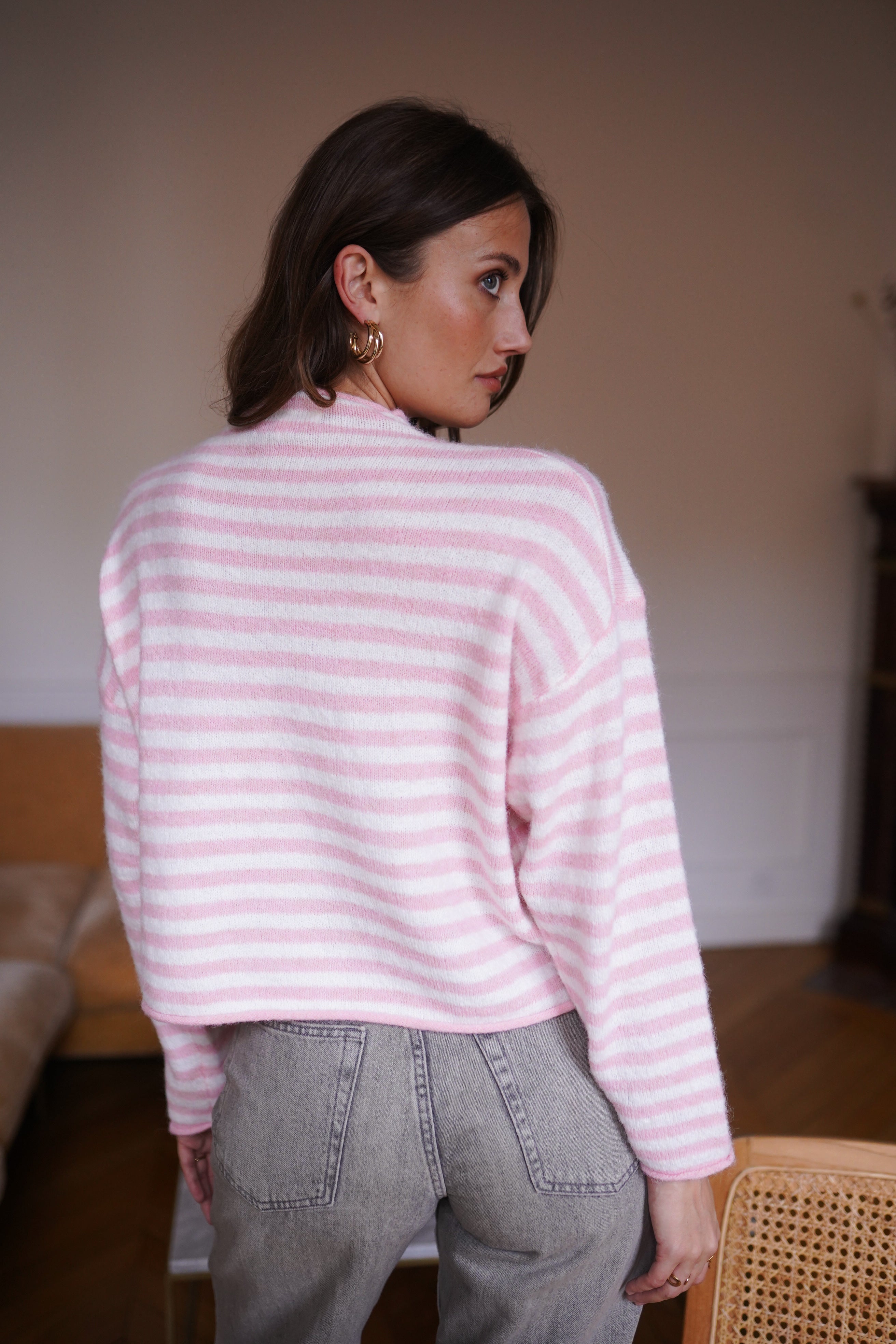 Maille douce et moelleuse aux rayures rose pâle et écru.