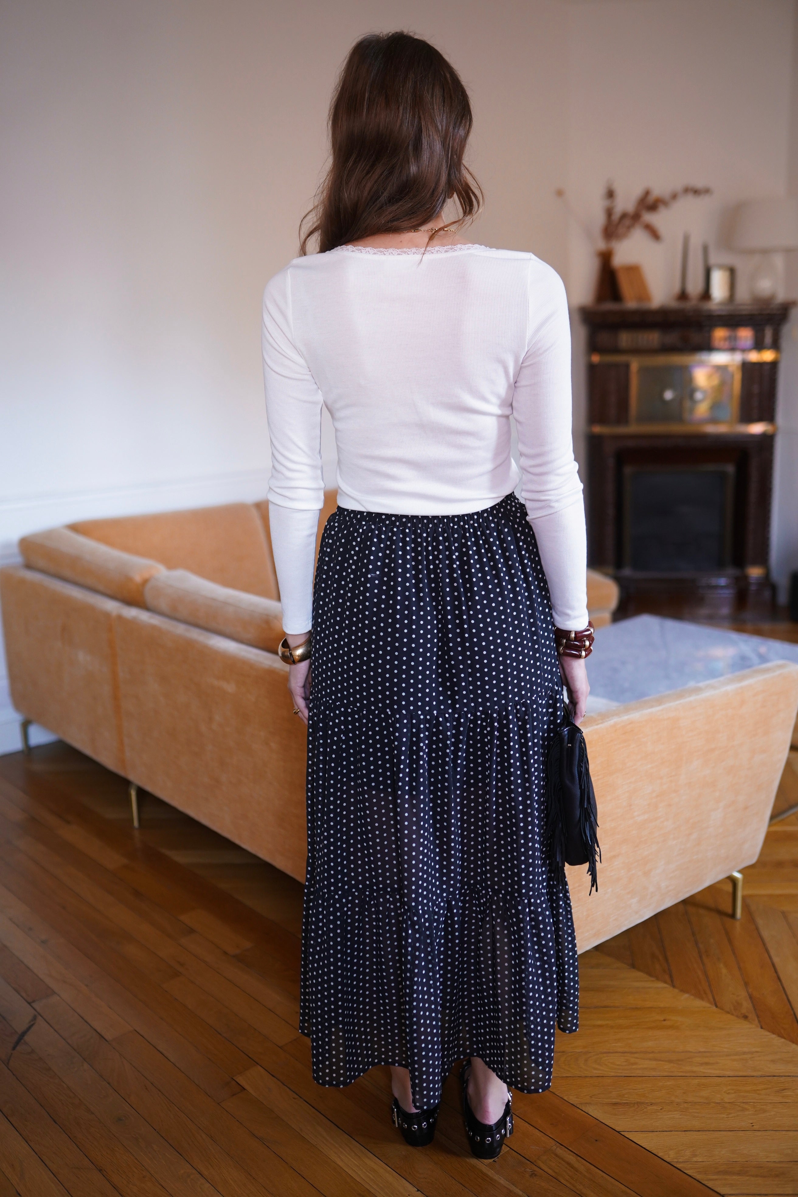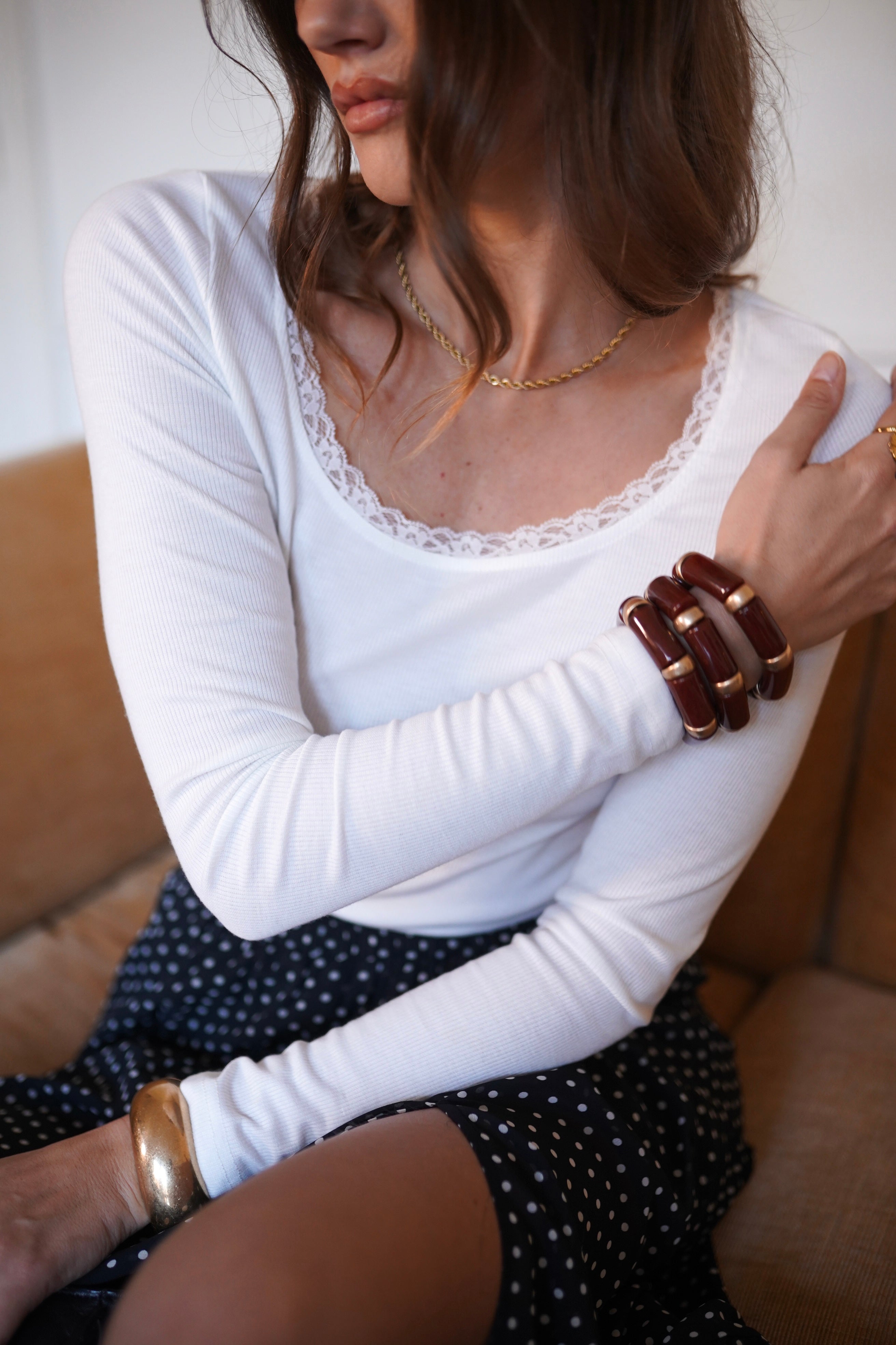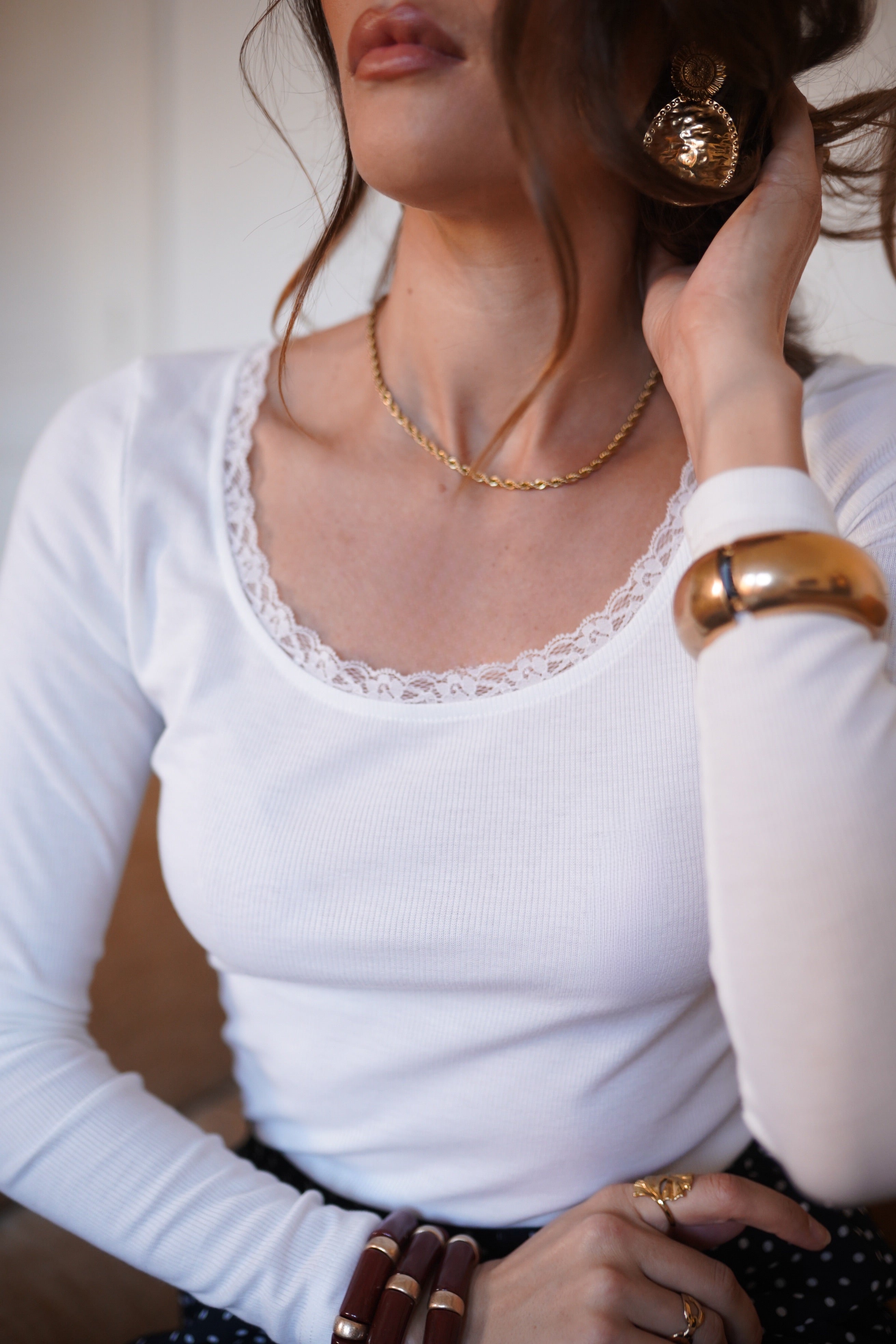 - Encolure arrondie soulignée d’un liseré en dentelle délicate.