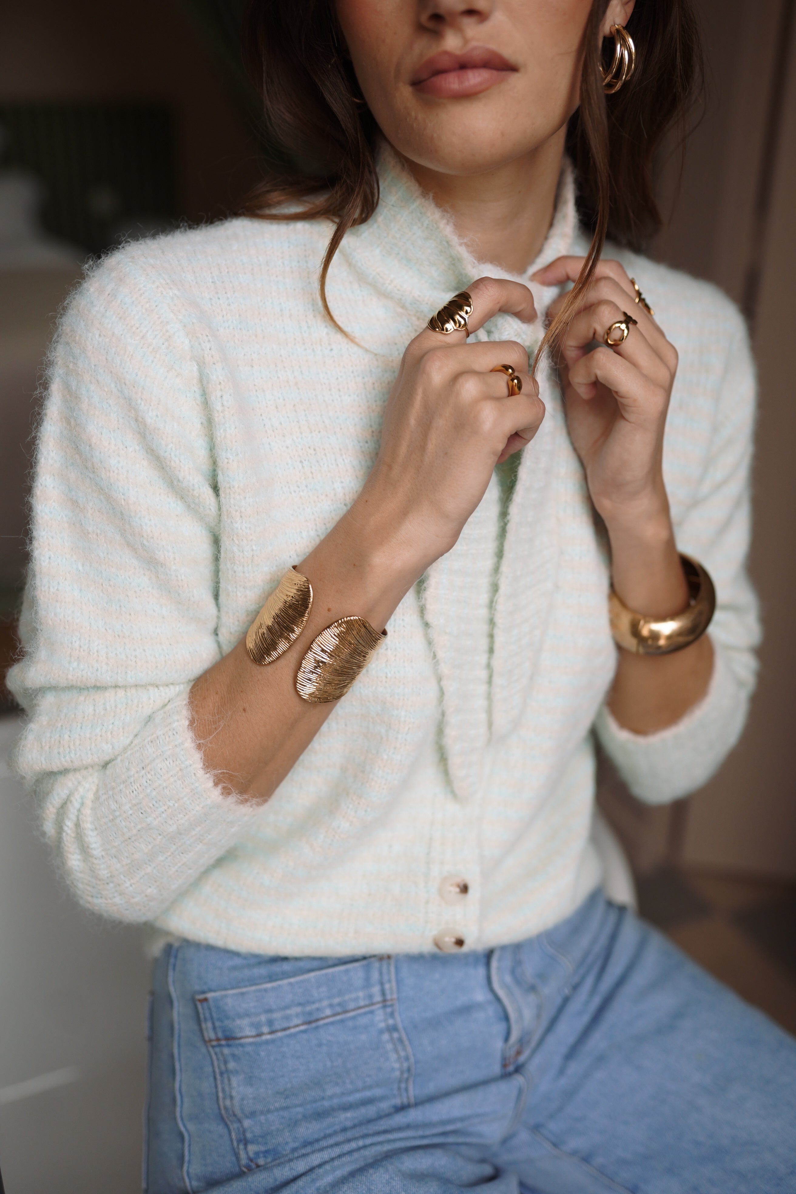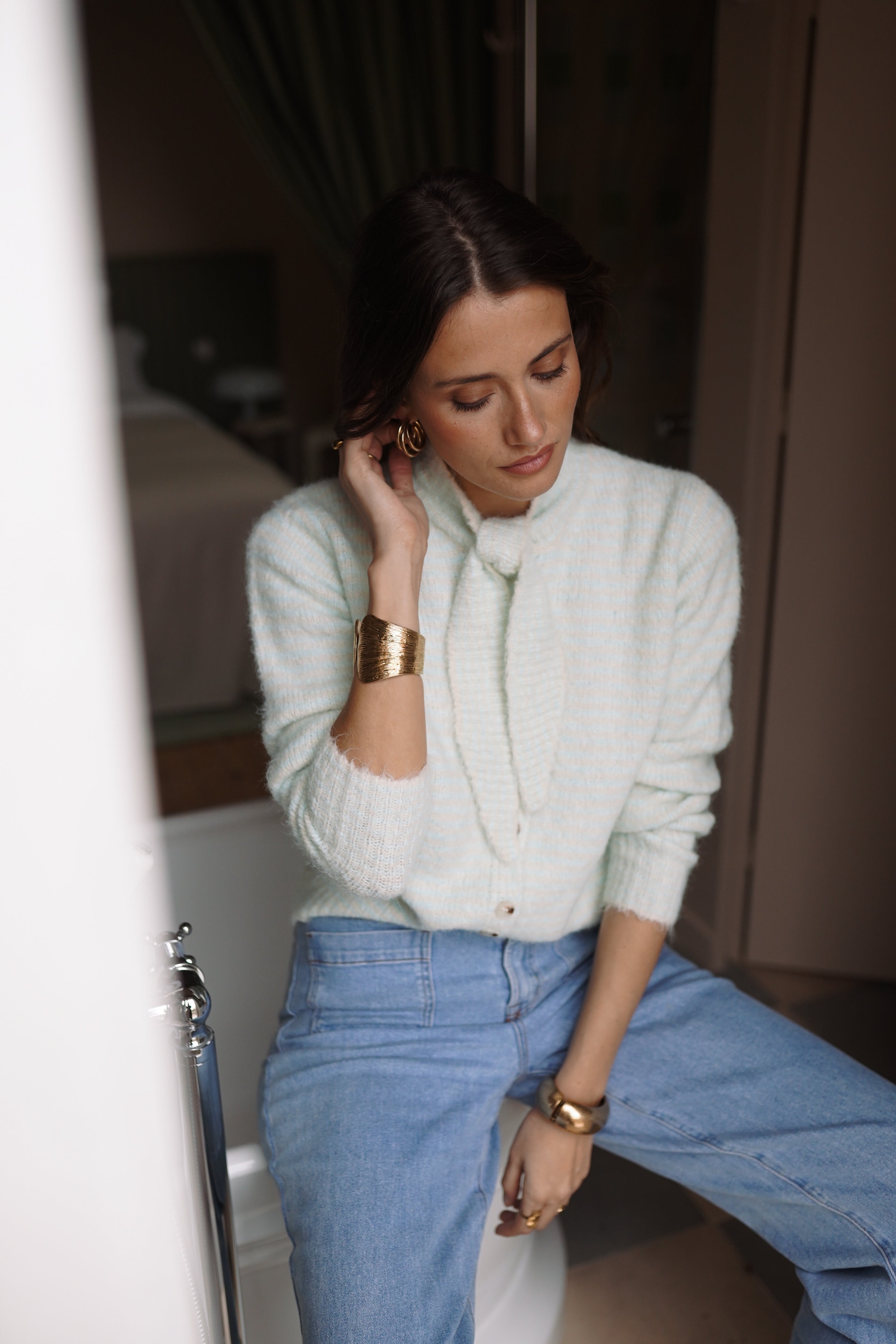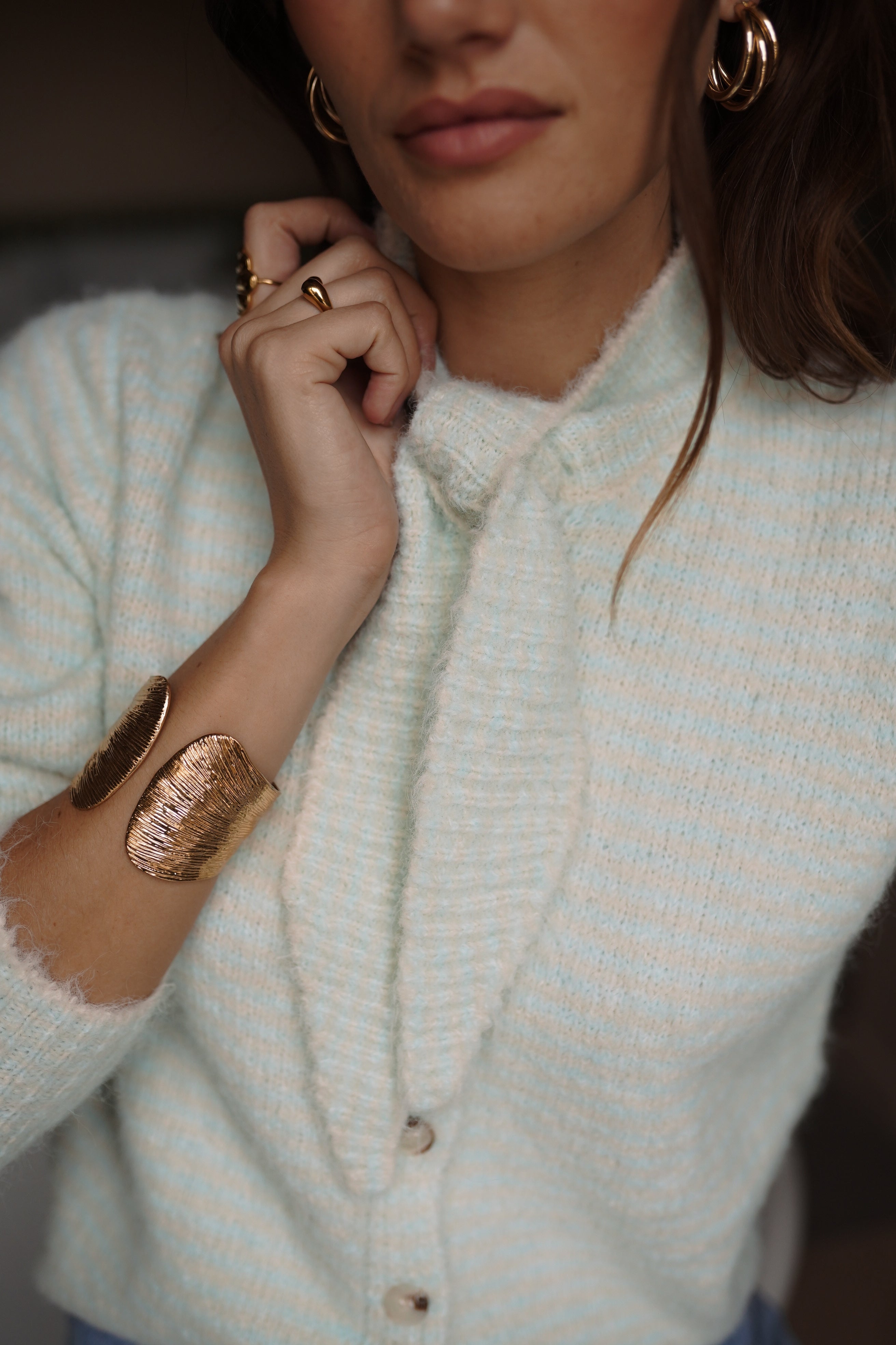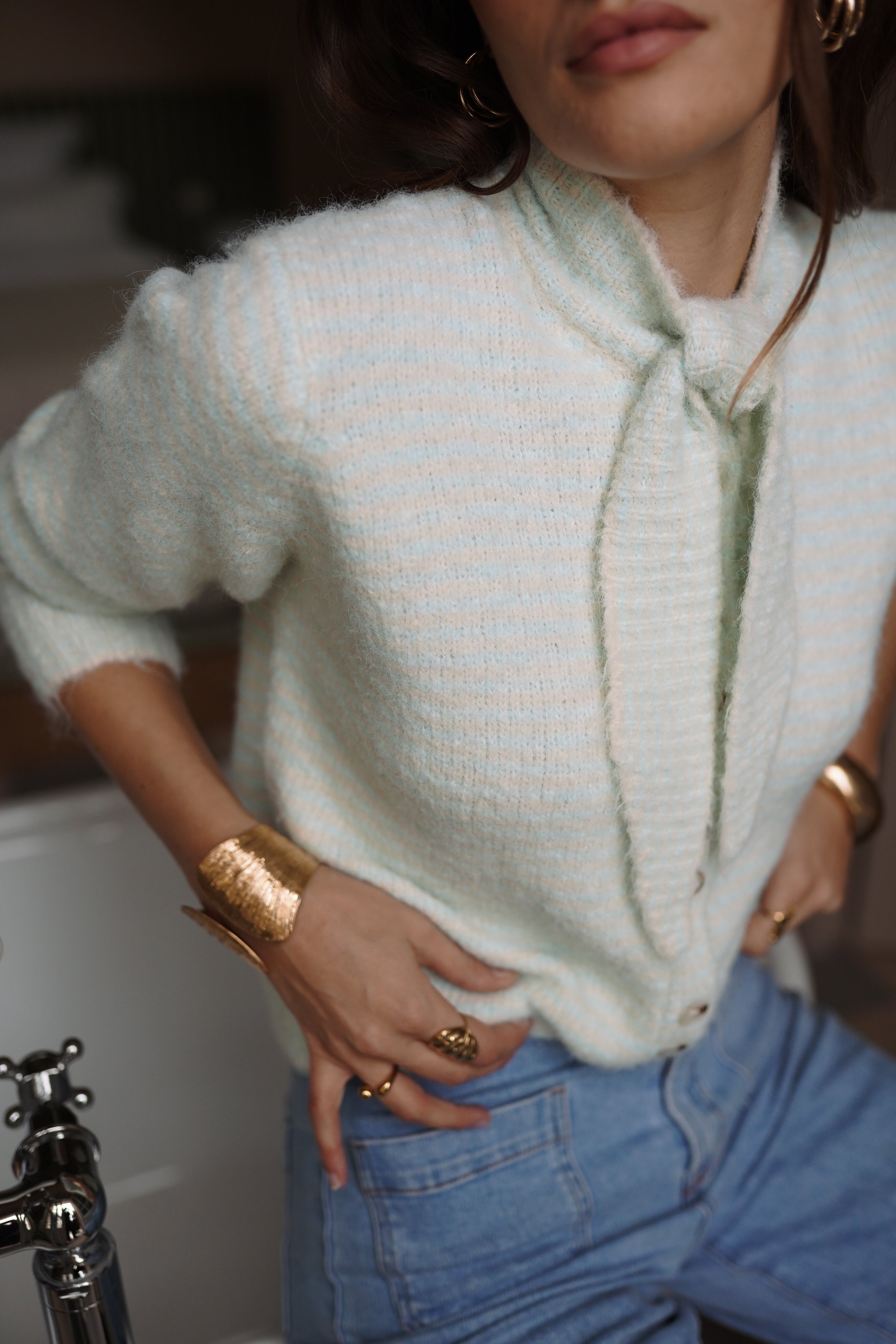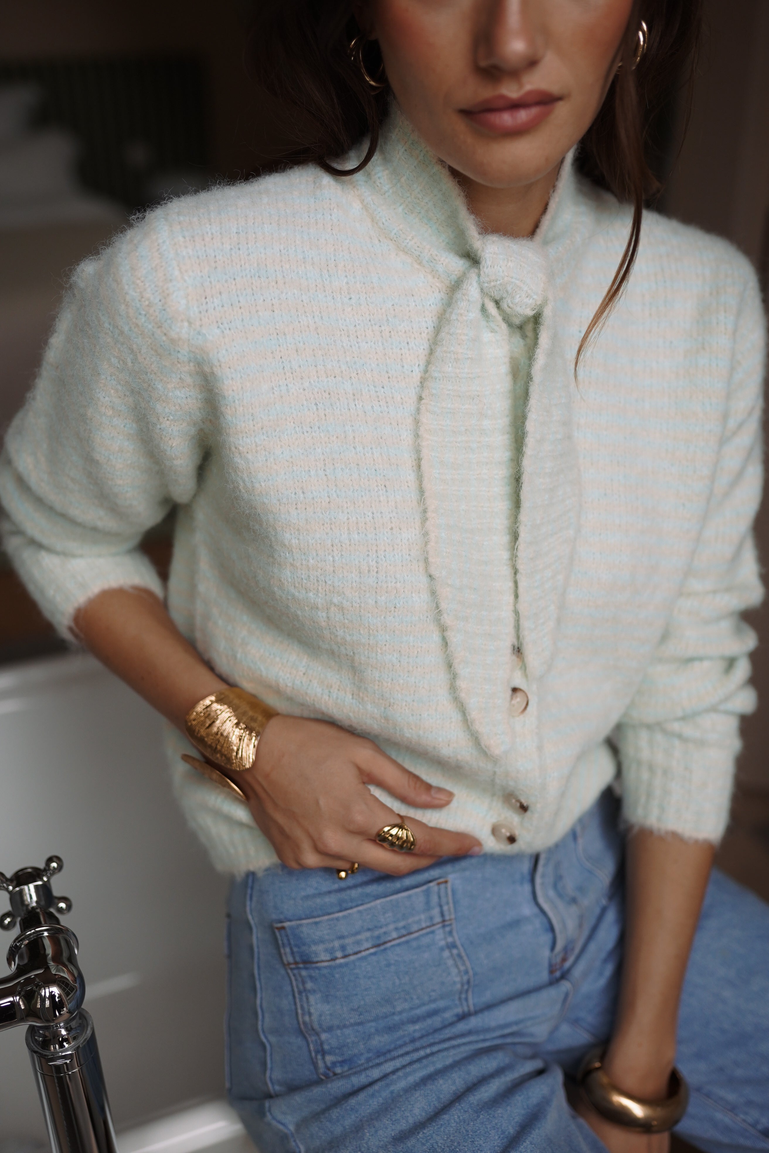 Auguste mise sur une maille texturée et une teinte douce, avec un col noué qui structure la silhouette.
