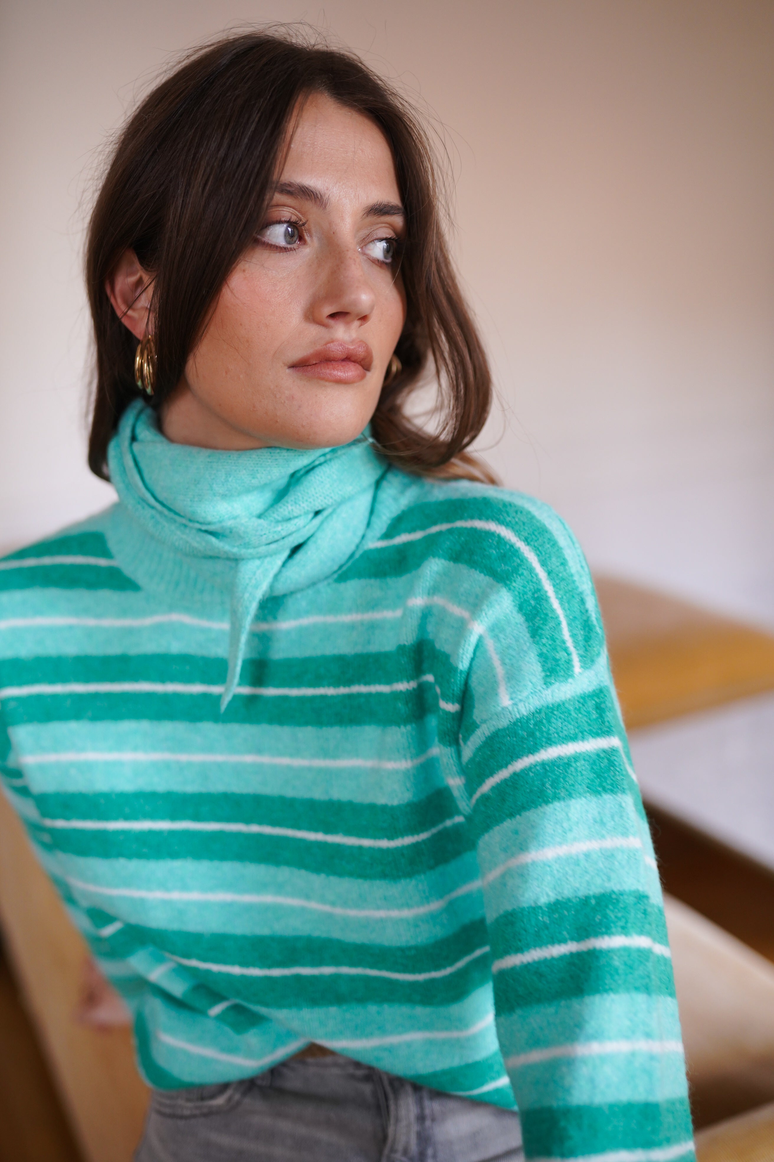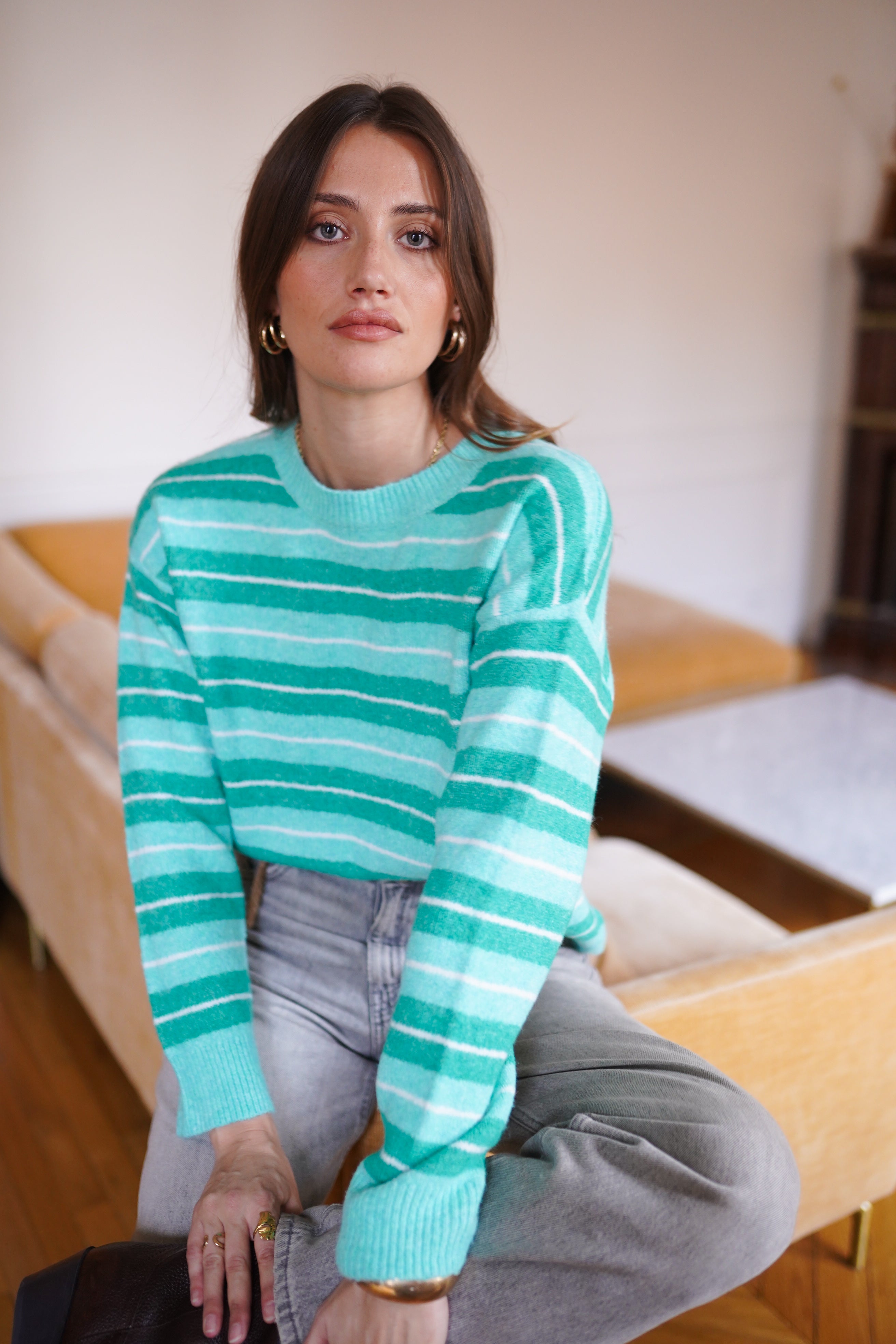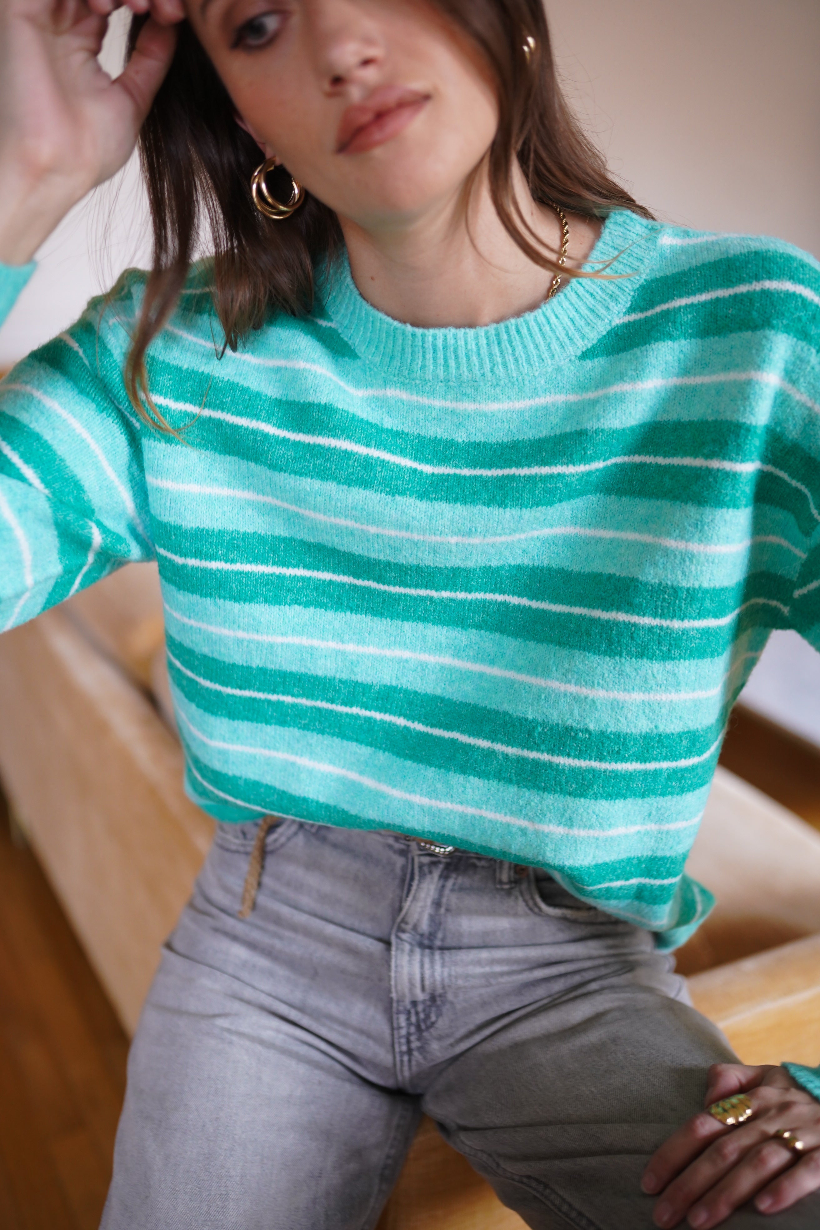 - Maille douce et confortable aux rayures vert d’eau