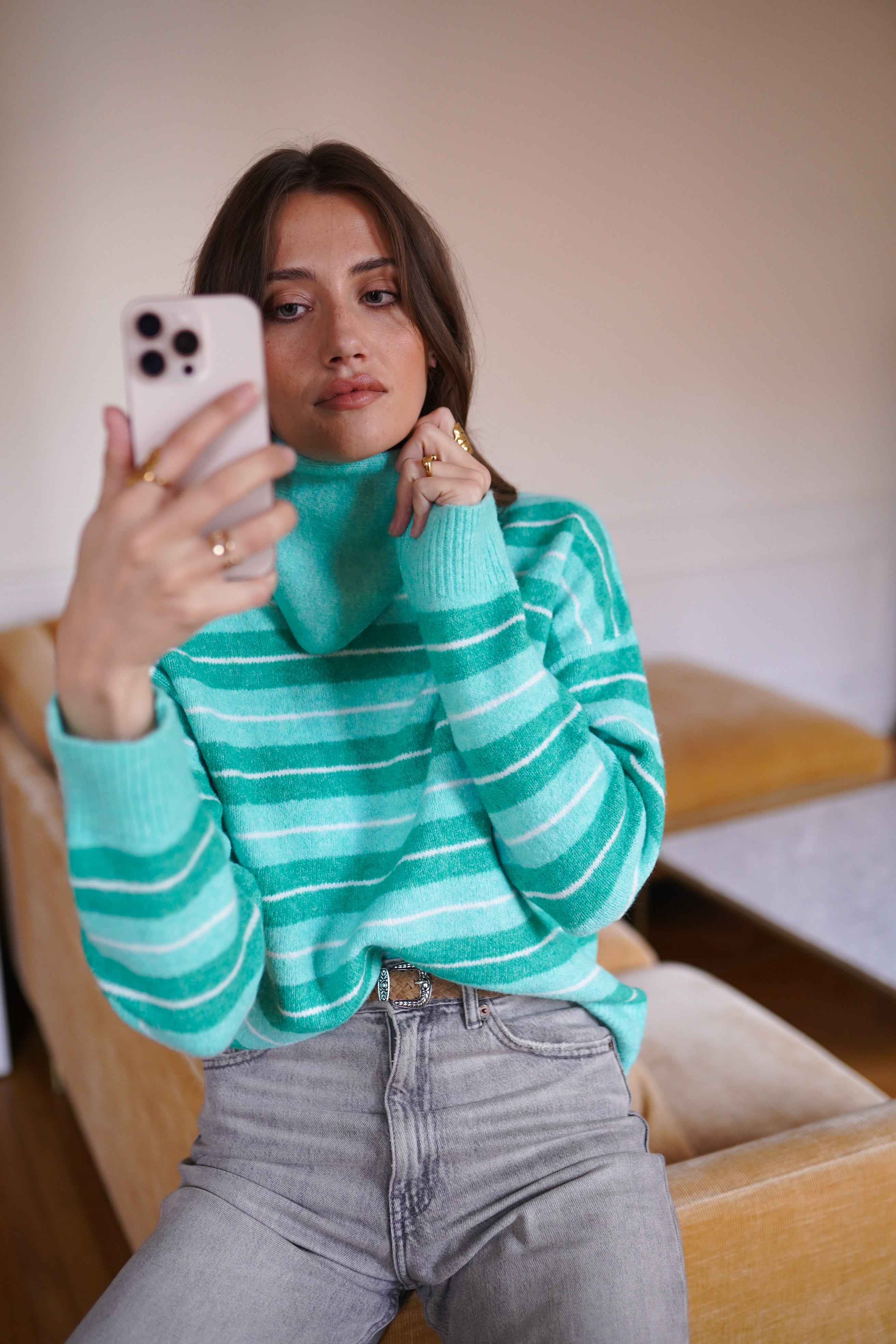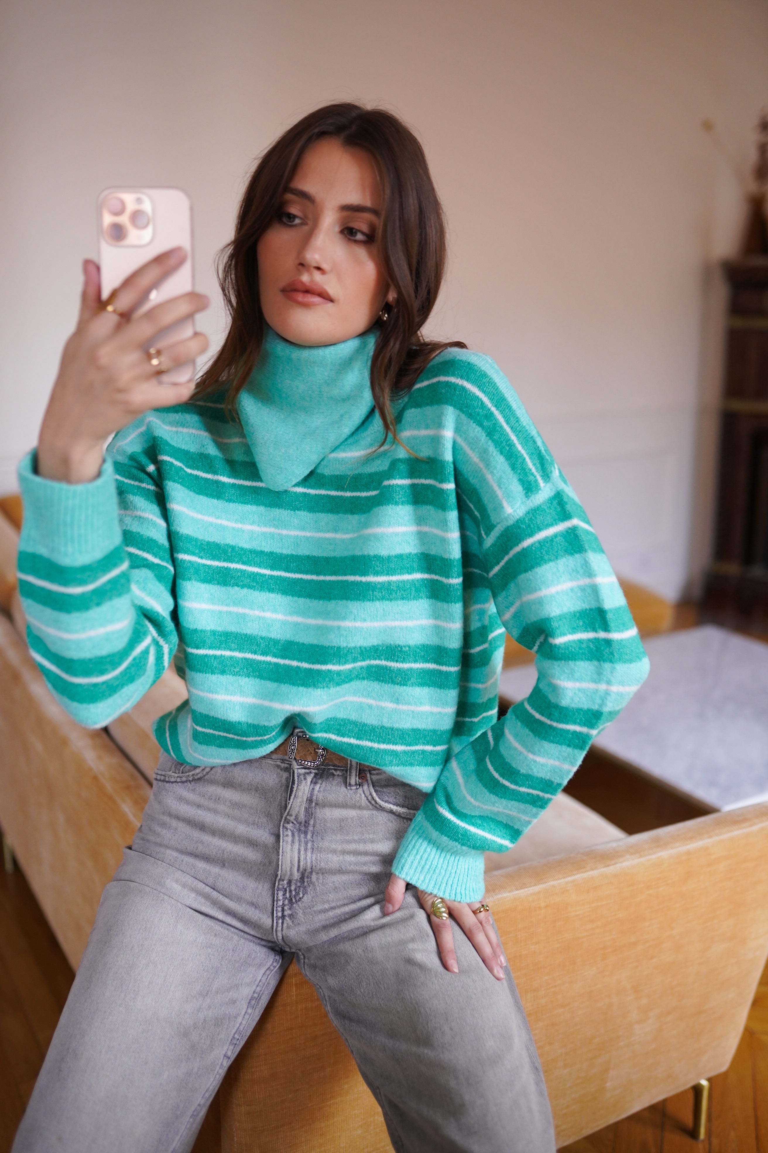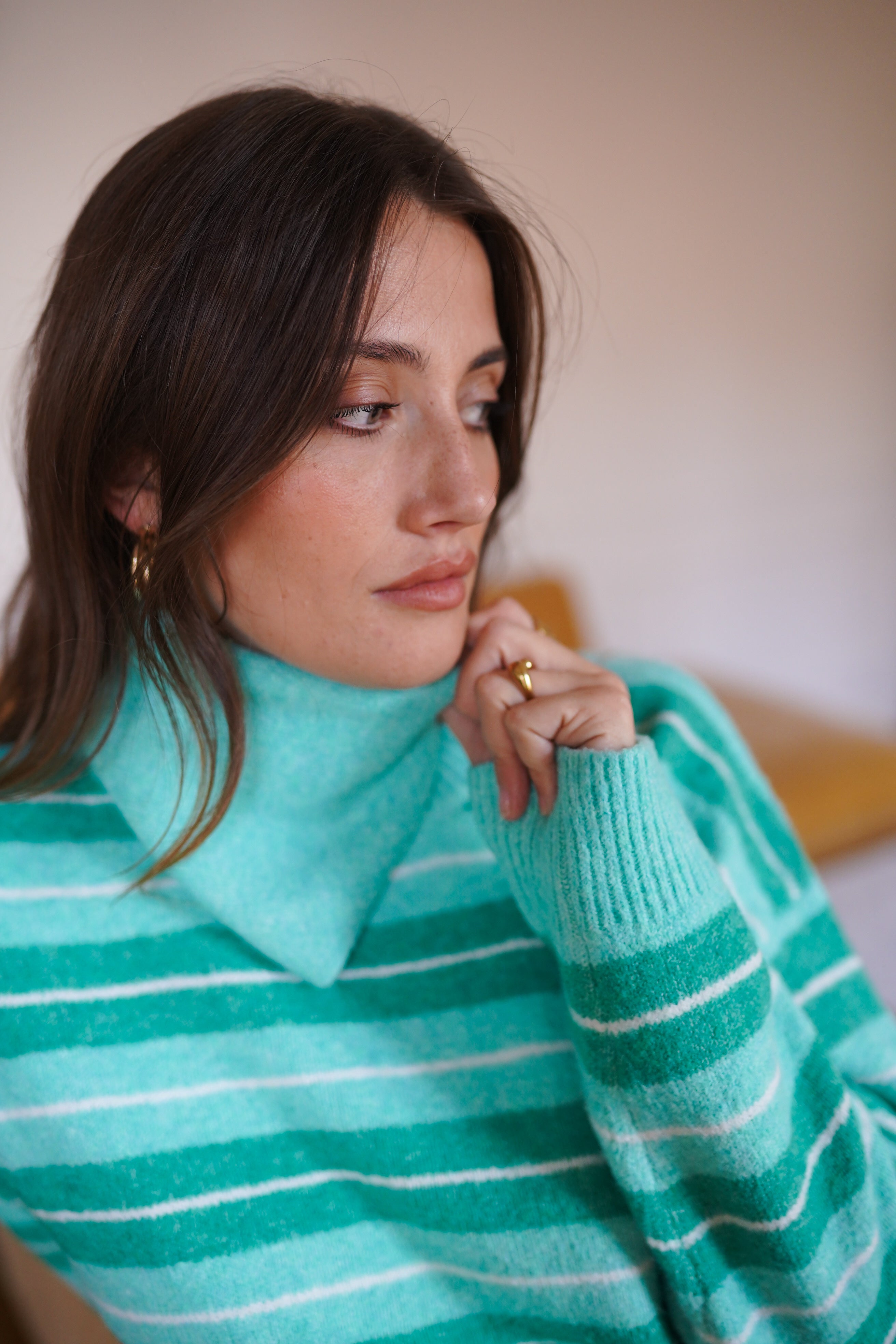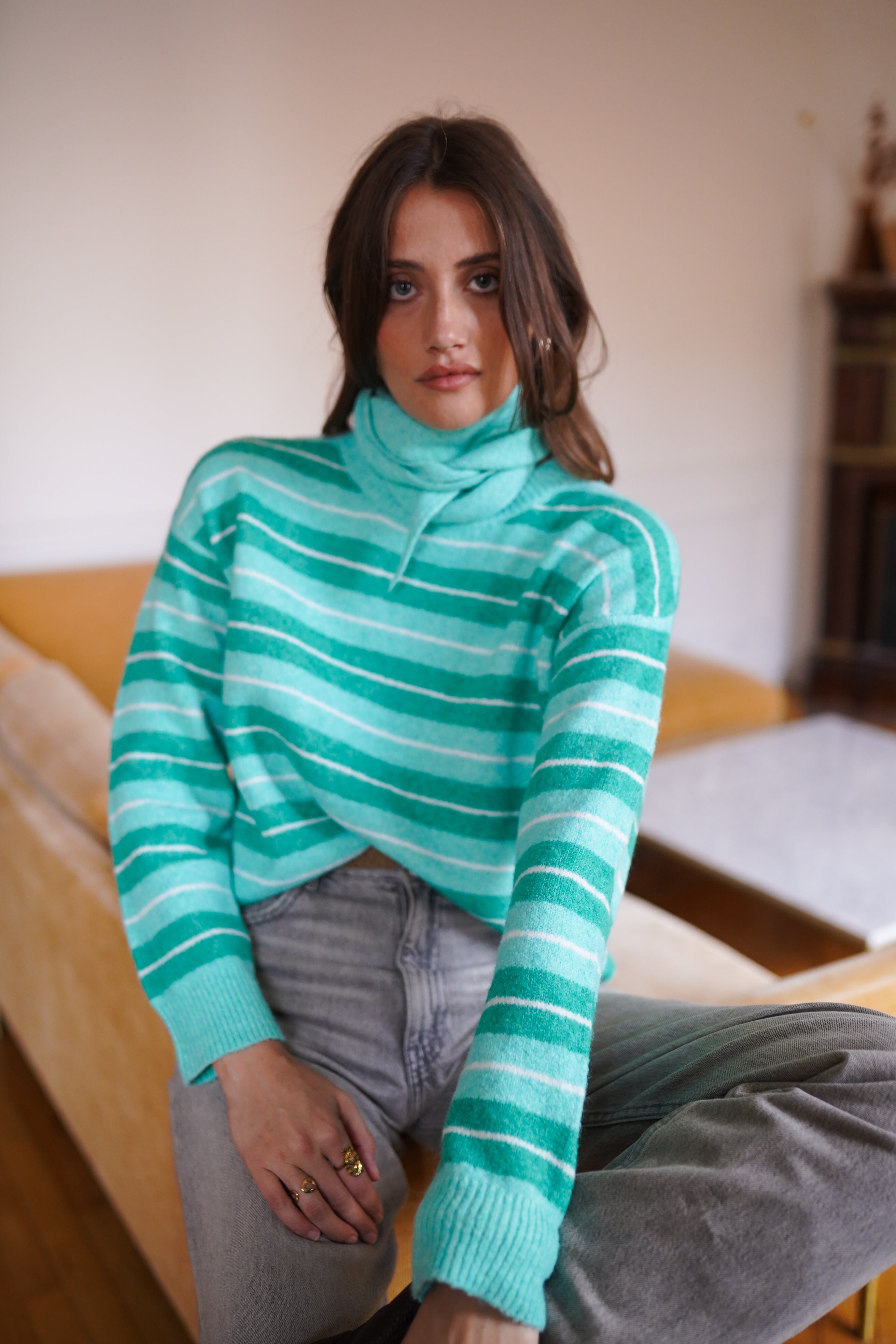 - Maille douce et confortable aux rayures vert d’eau