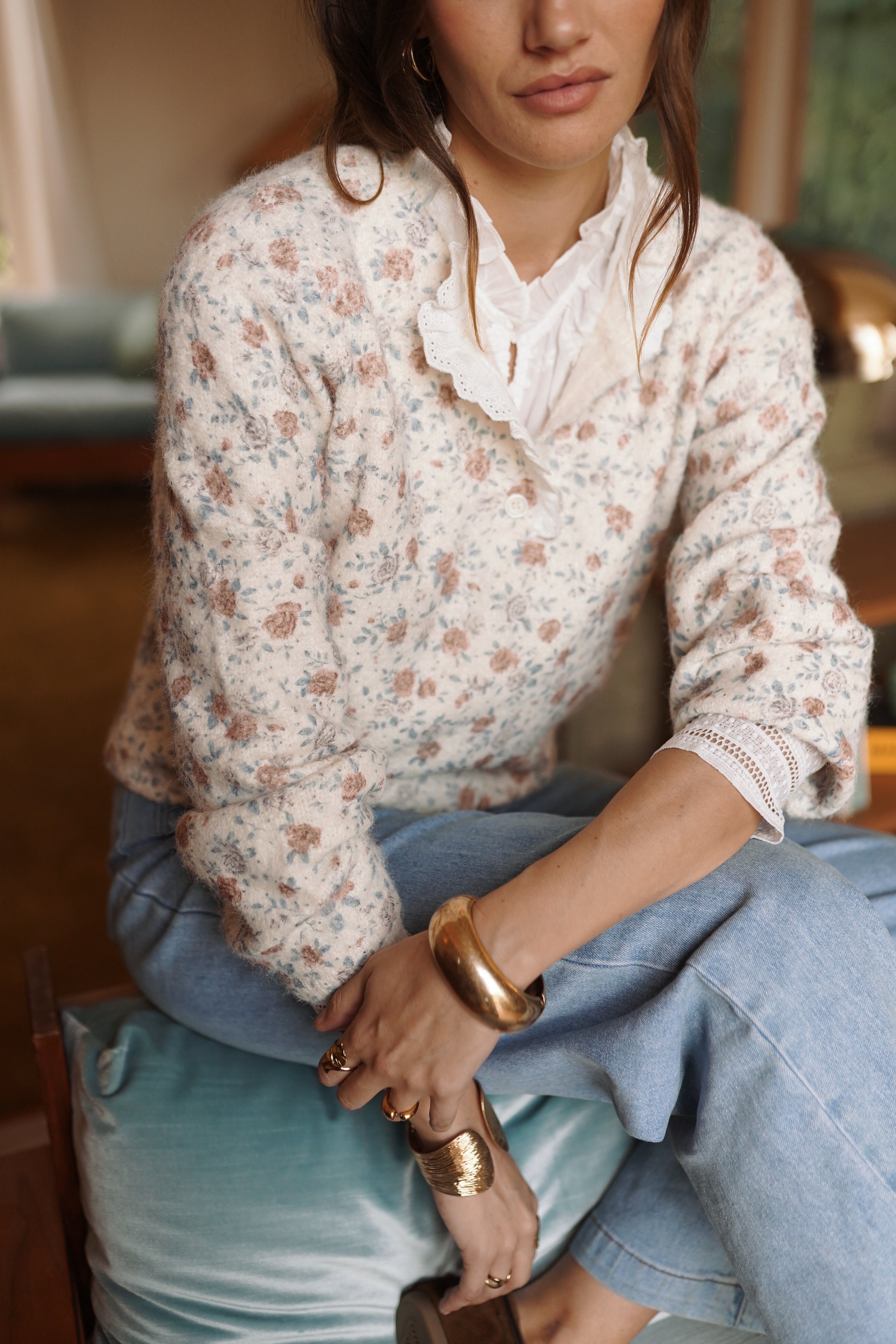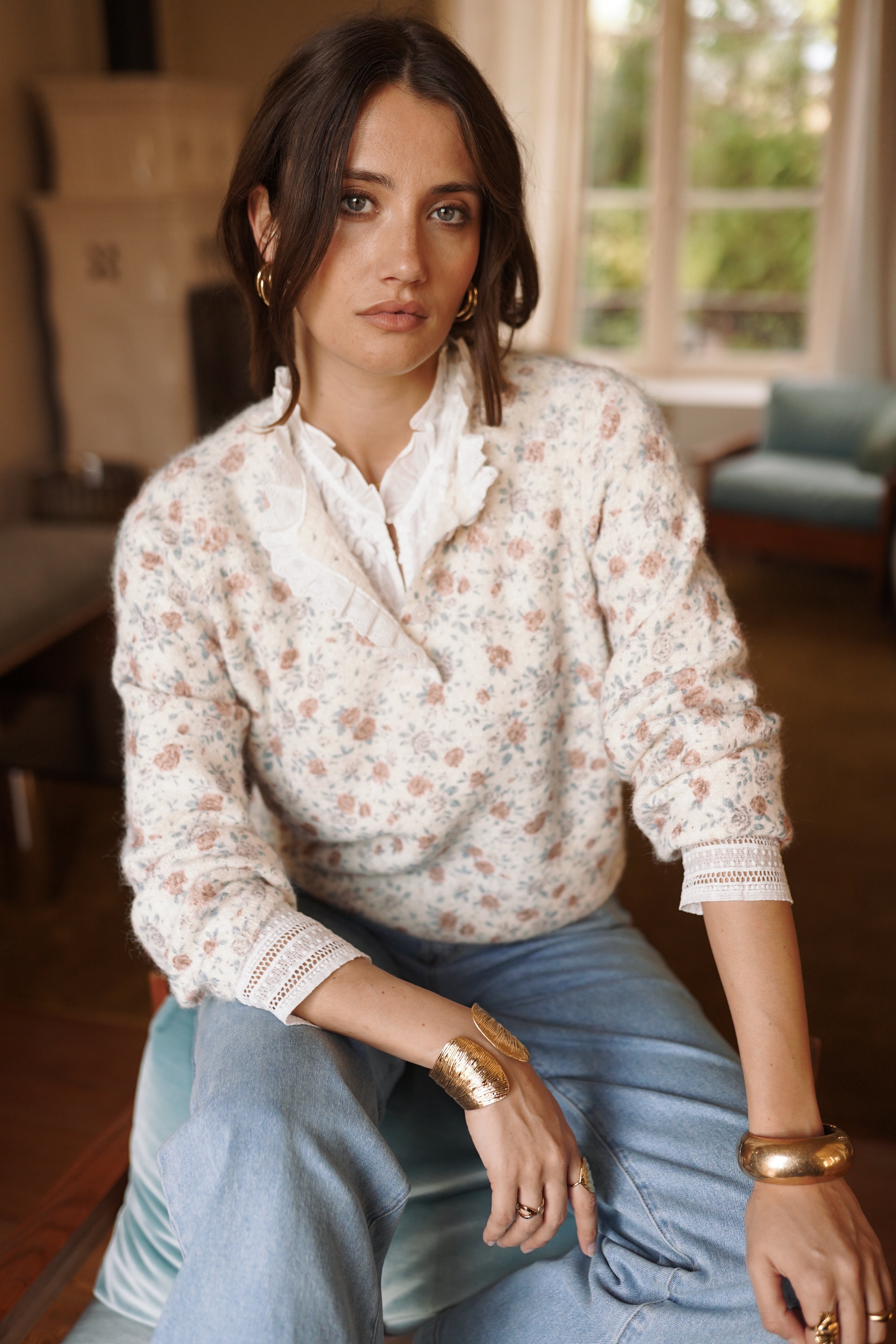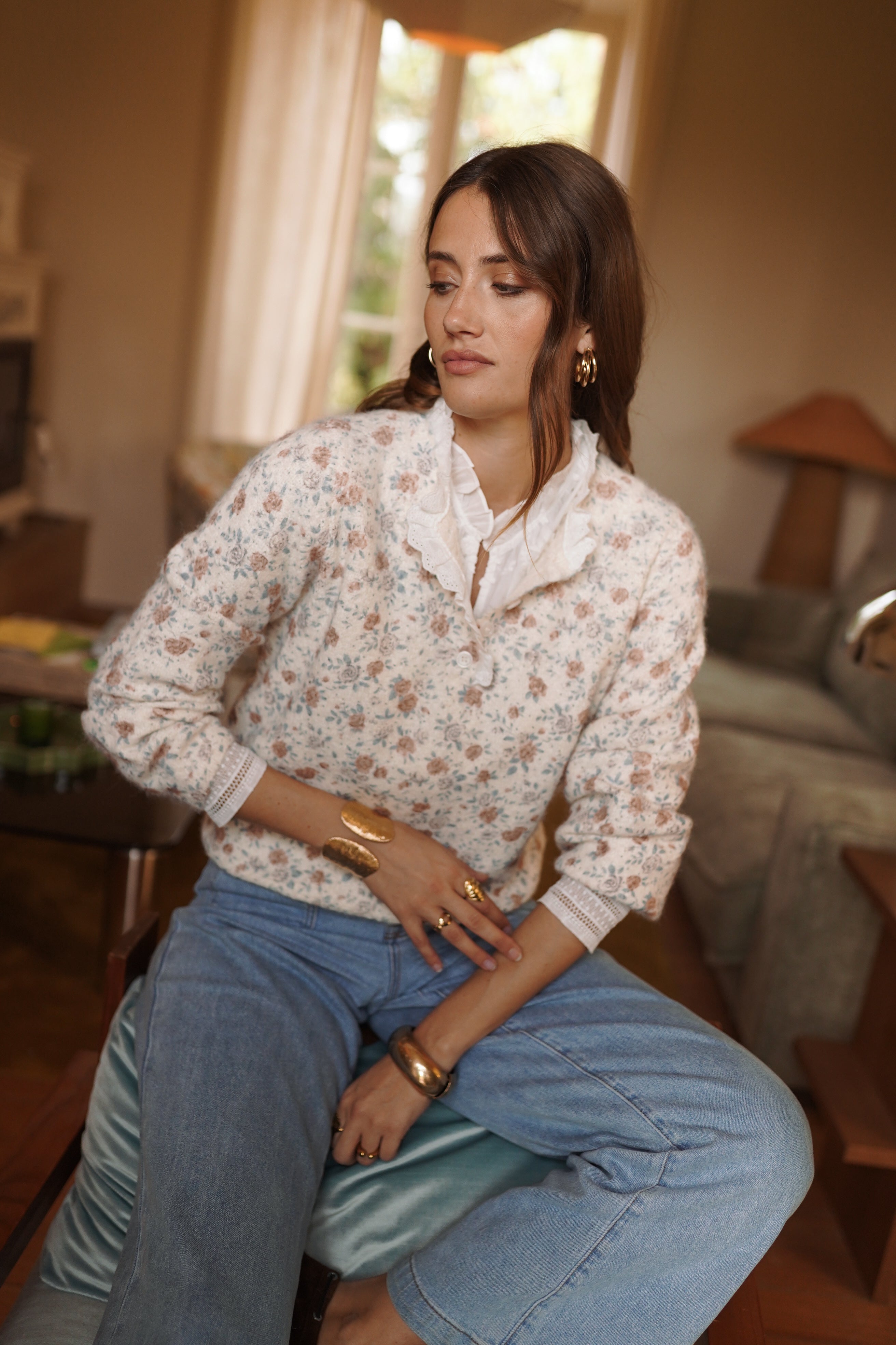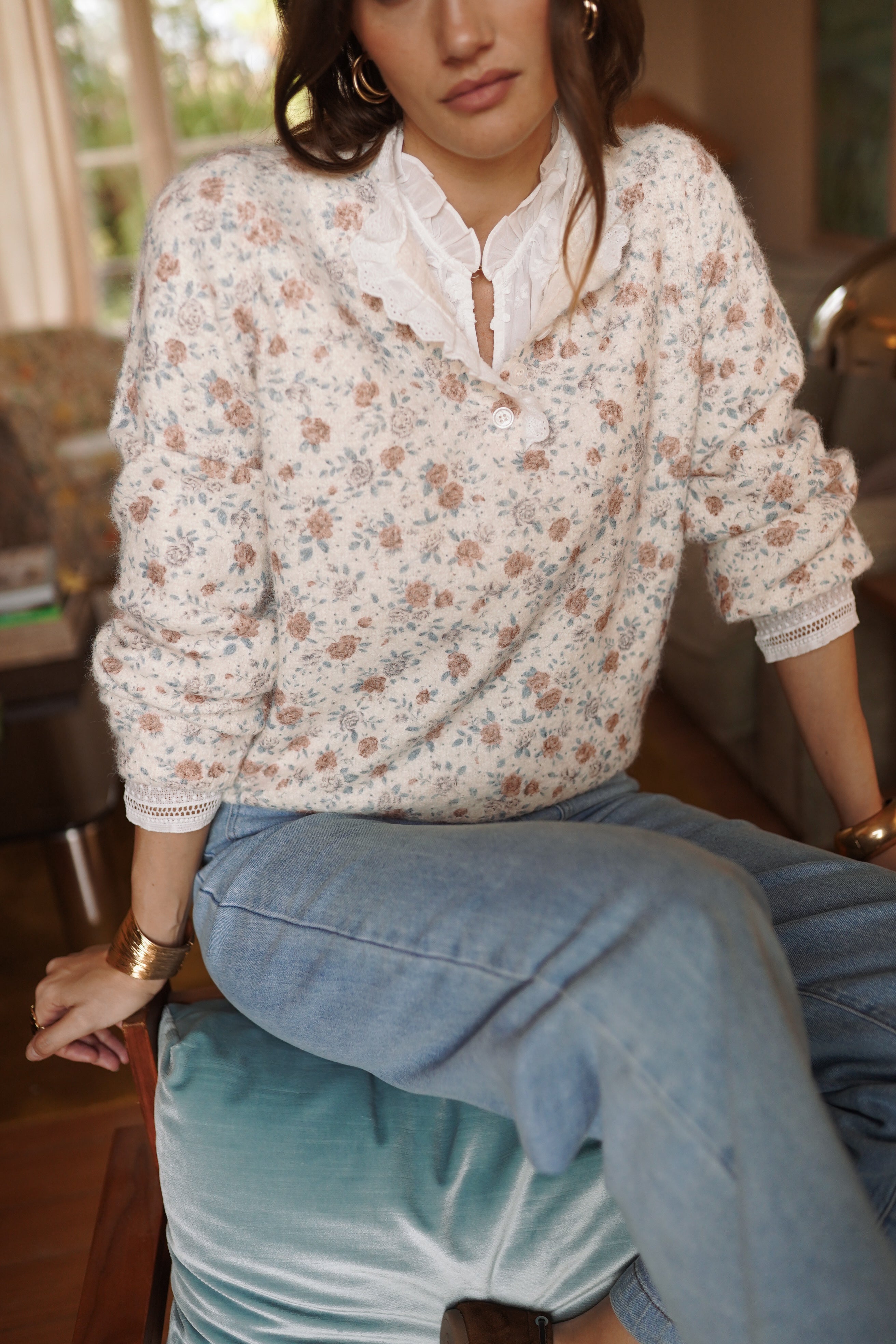 La maille Éve joue l’équilibre entre un imprimé floral discret et une maille fine au toucher doux. L’encolure boutonnée et les finitions ajourées structurent la silhouette et apportent du relief, une pièce forte pour le vestiaire de la saison.