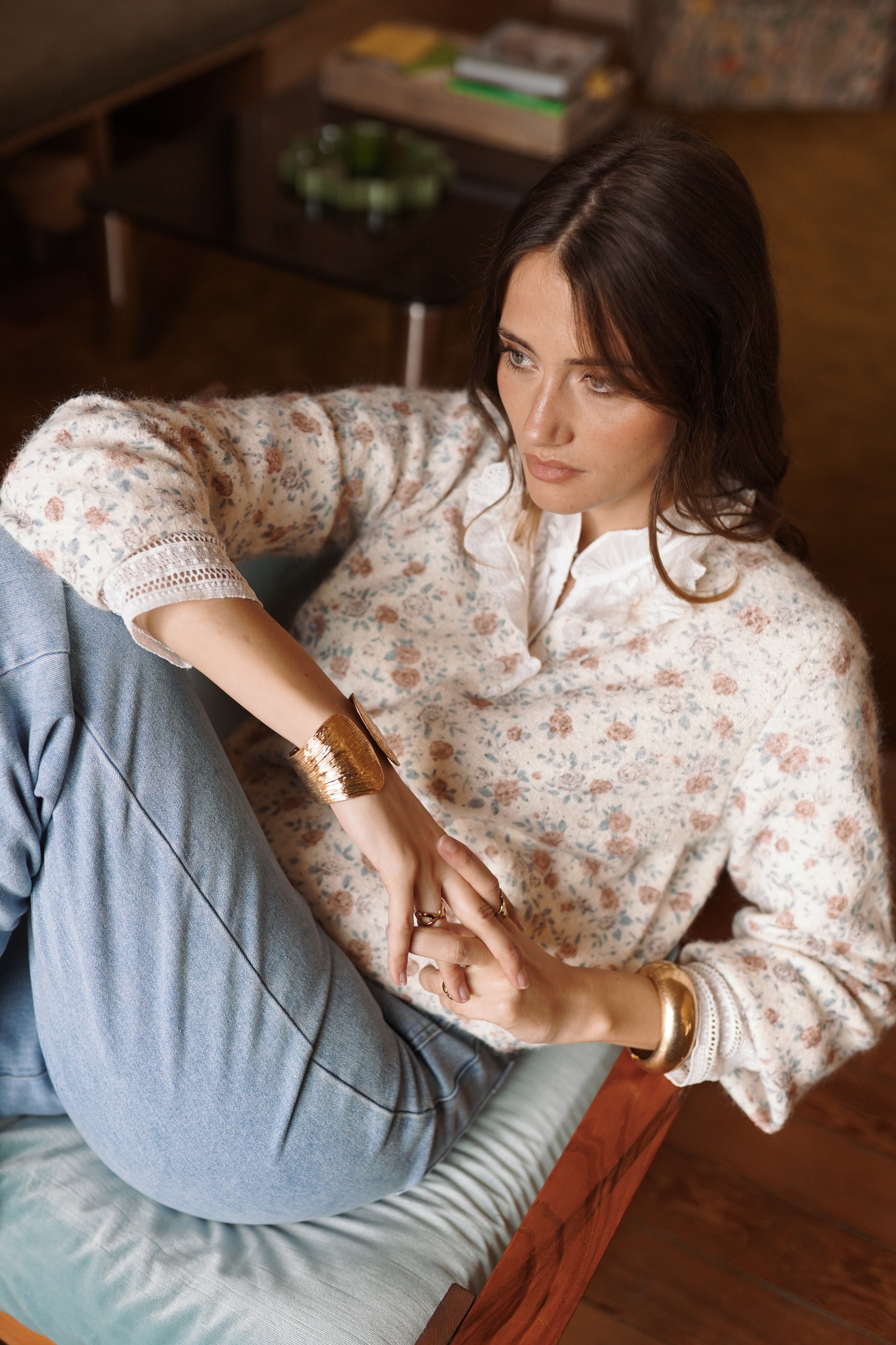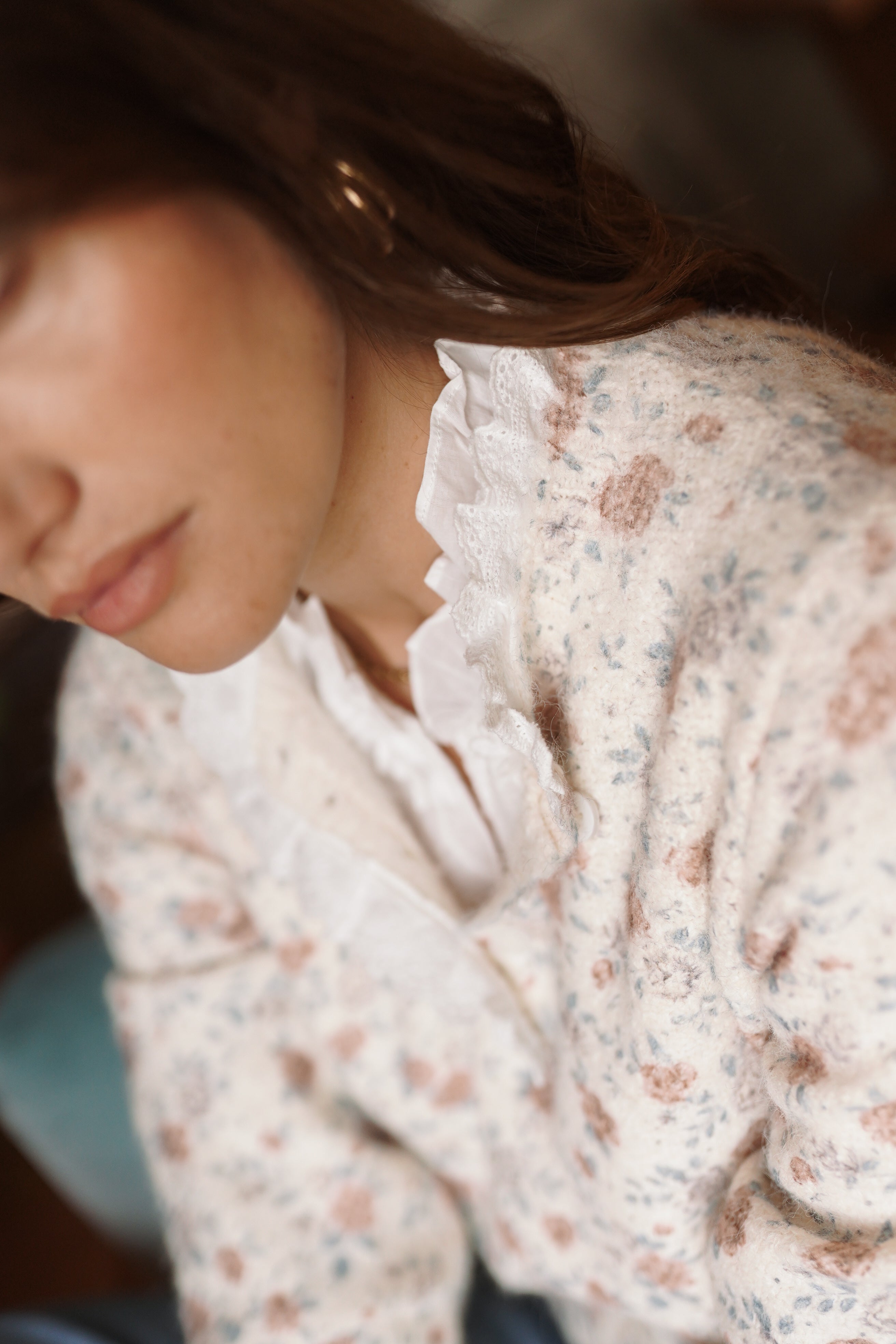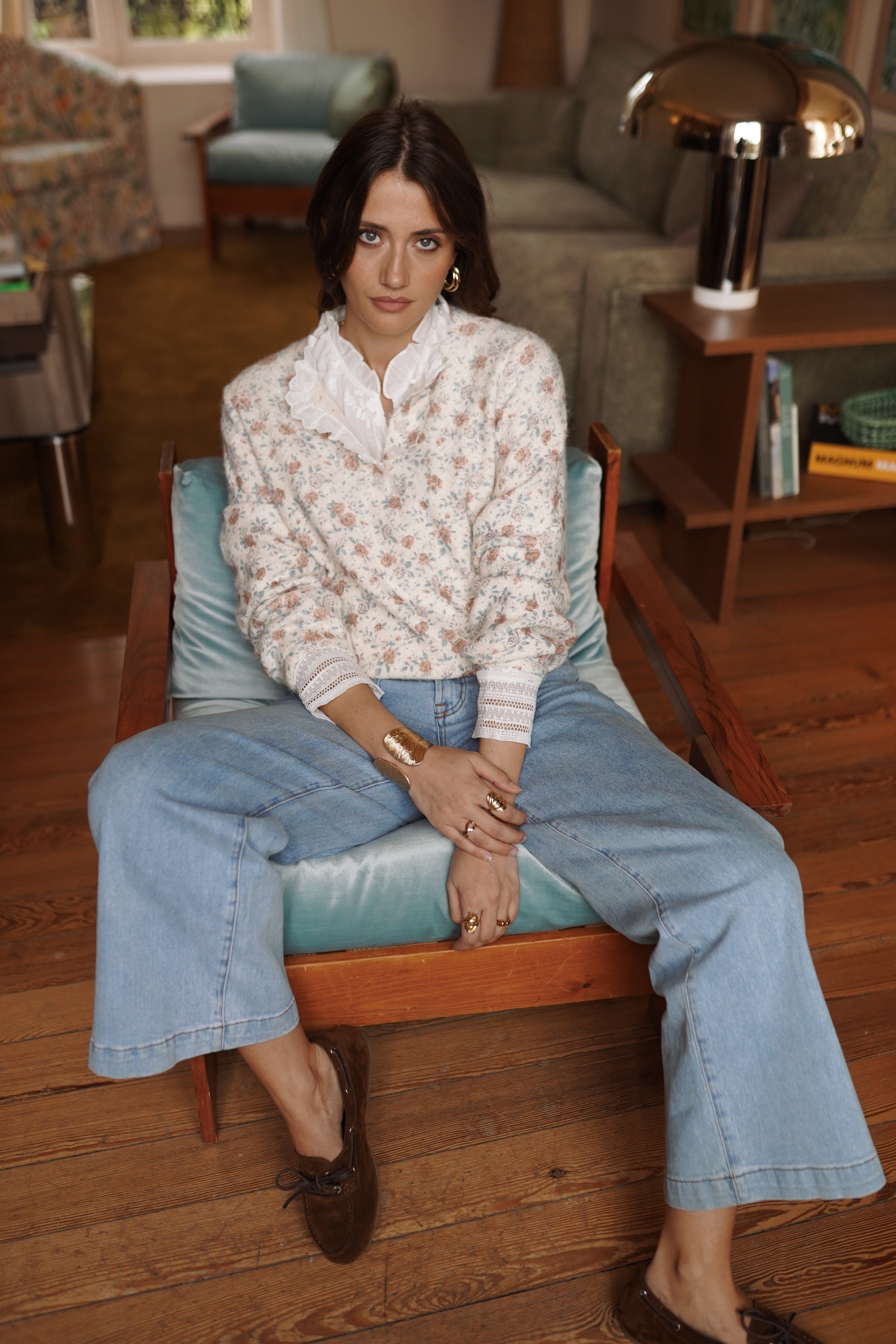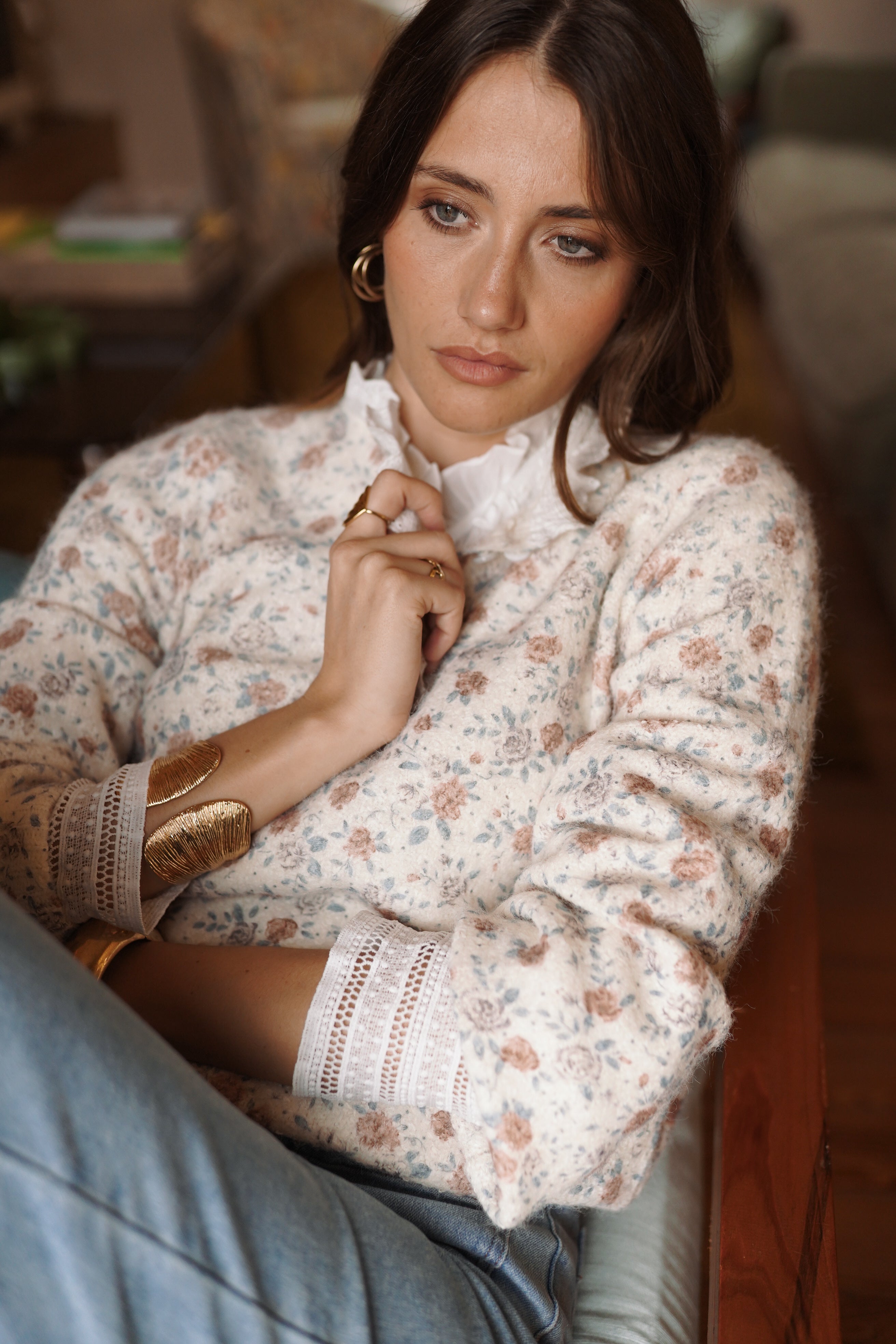 La maille Éve joue l’équilibre entre un imprimé floral discret et une maille fine au toucher doux. L’encolure boutonnée et les finitions ajourées structurent la silhouette et apportent du relief, une pièce forte pour le vestiaire de la saison.