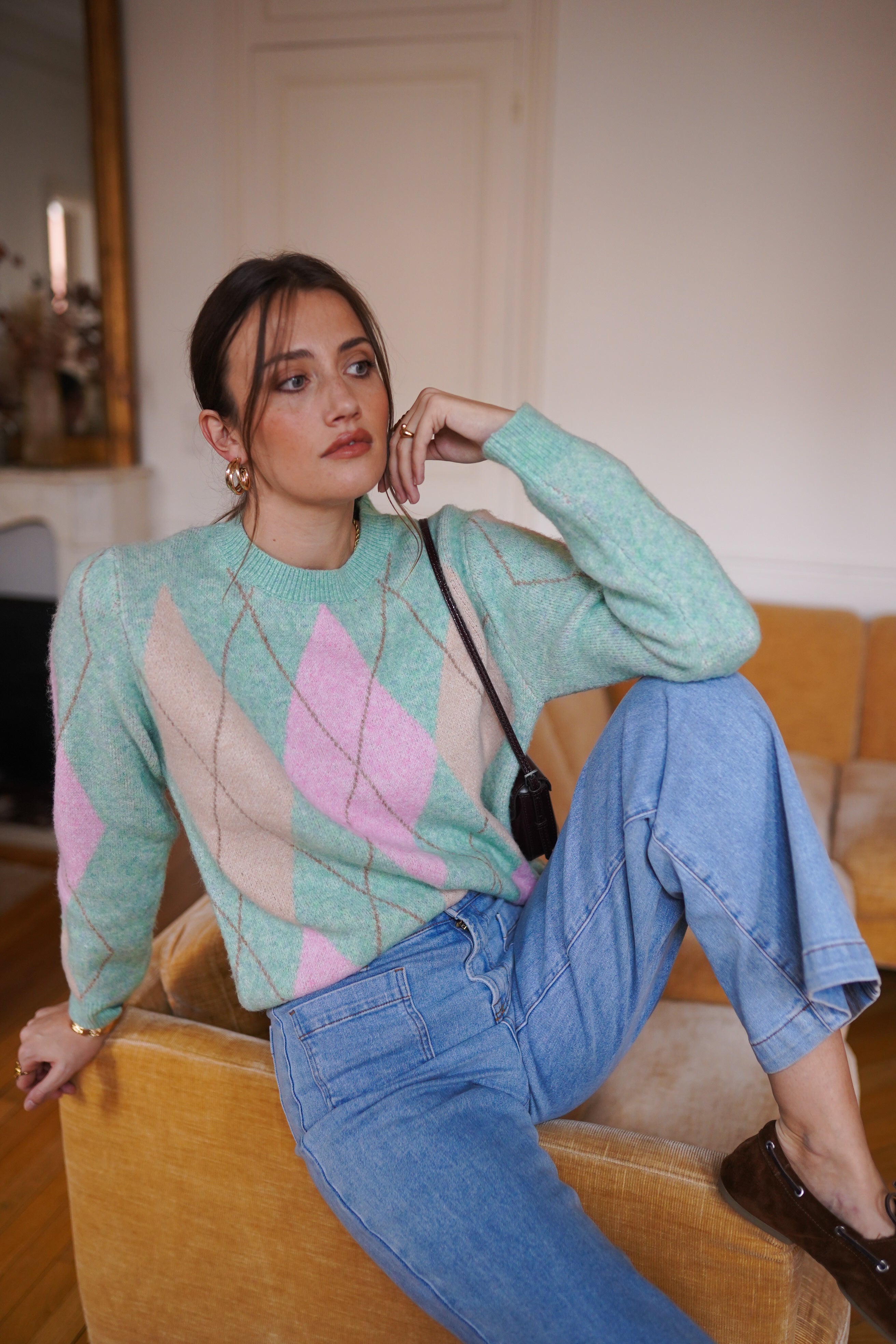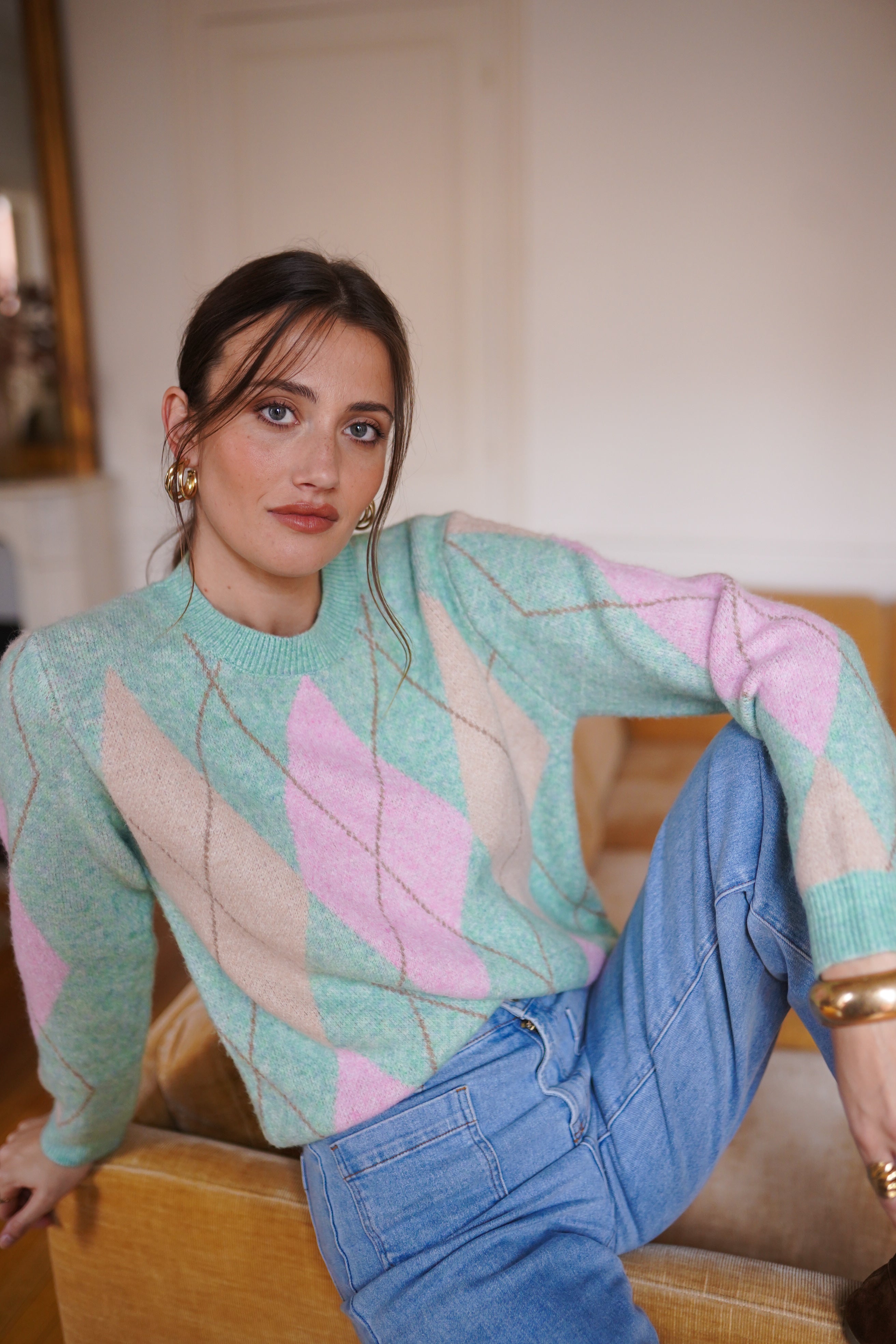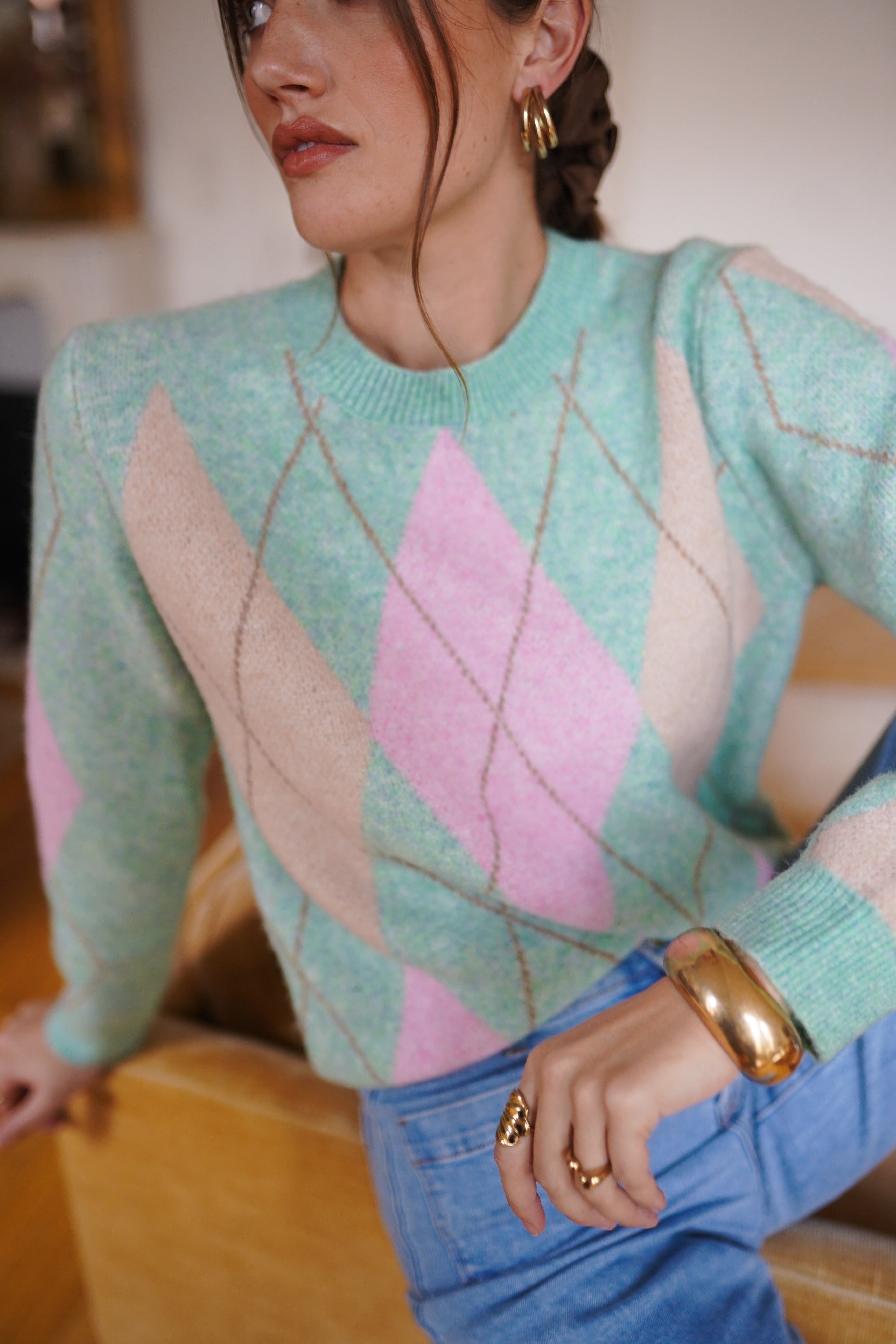 Maille douce et légère à motif losanges vert d’eau, rose pâle et écru.