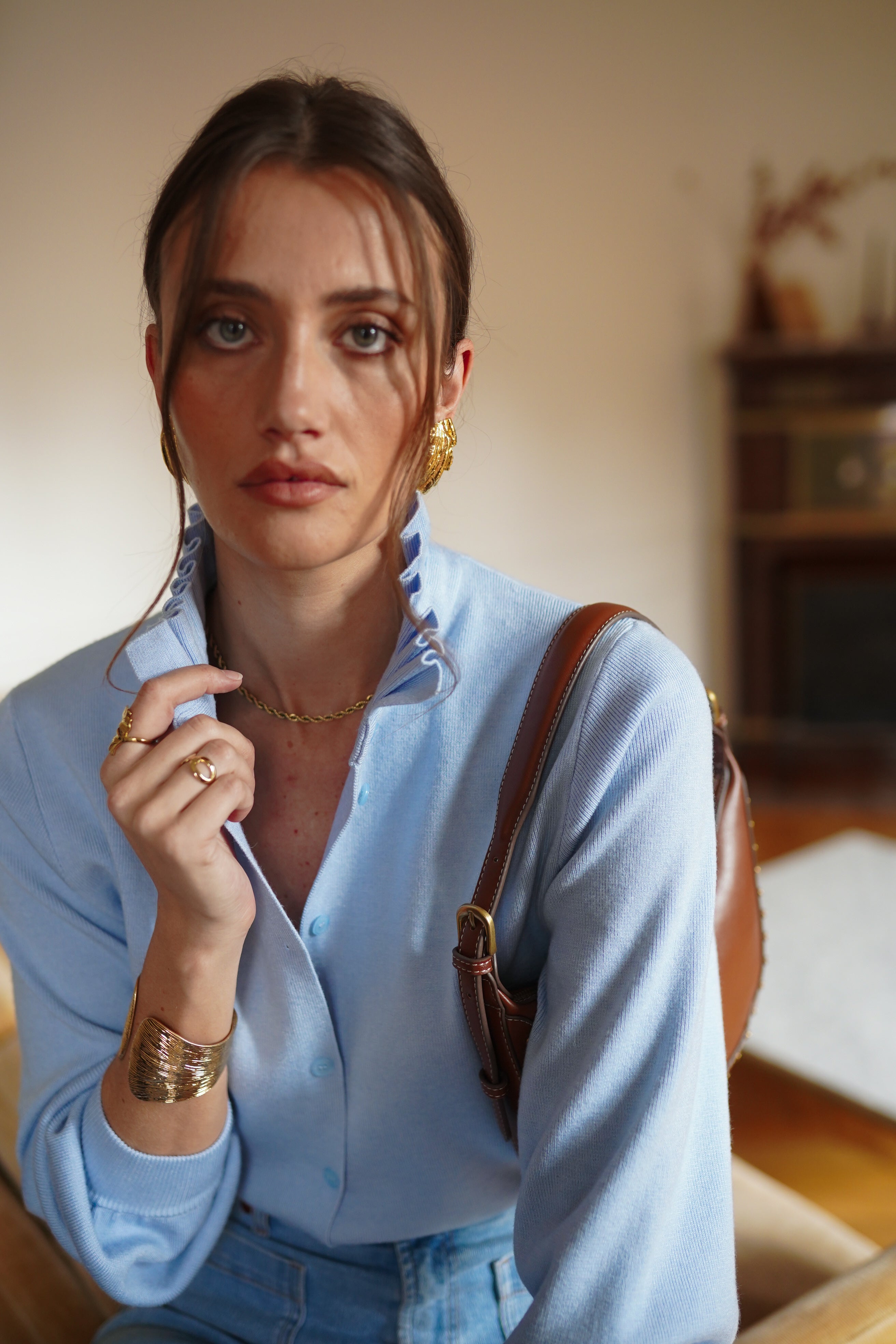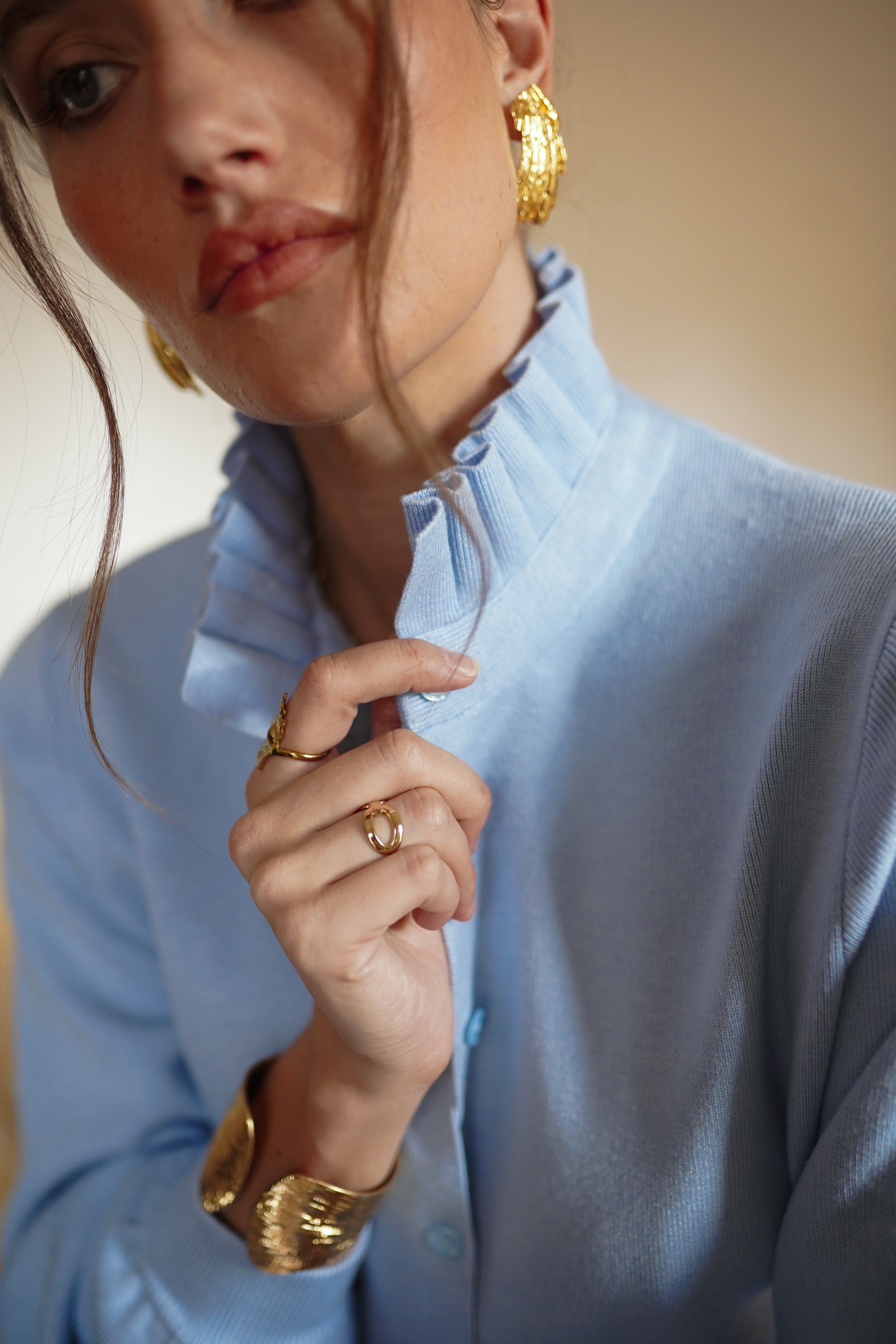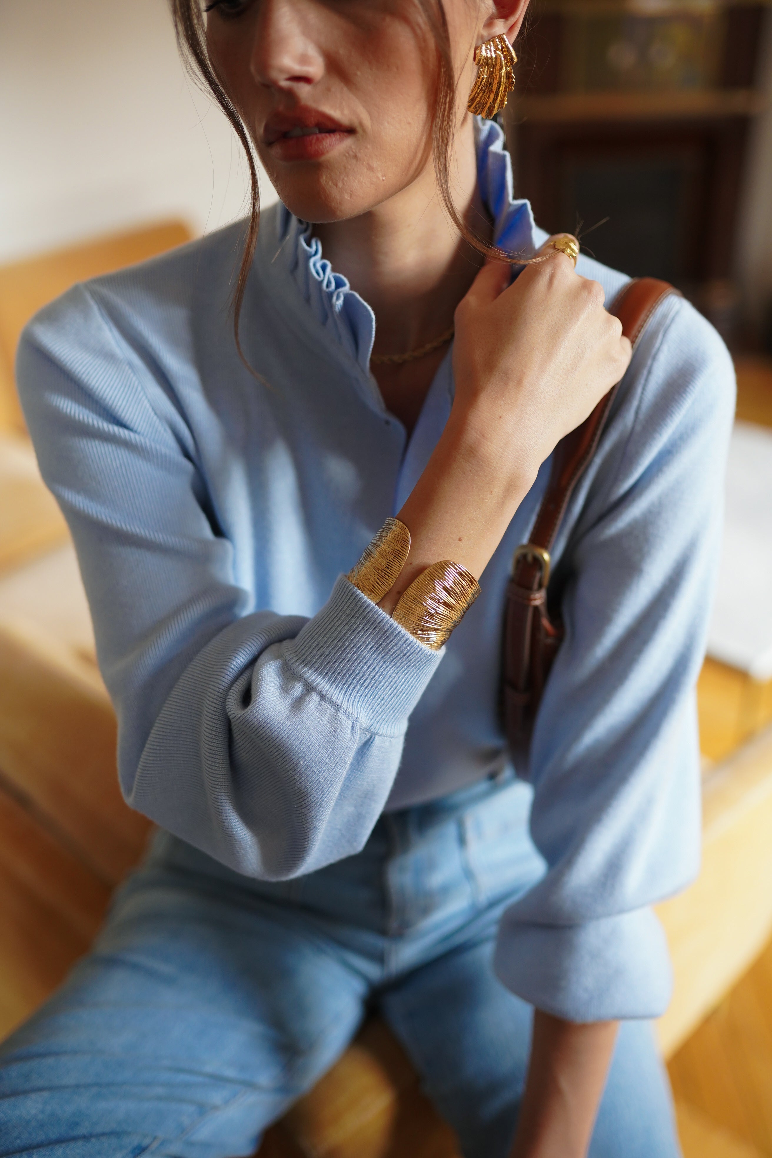 - Encolure légèrement montante avec finition délicatement froncée