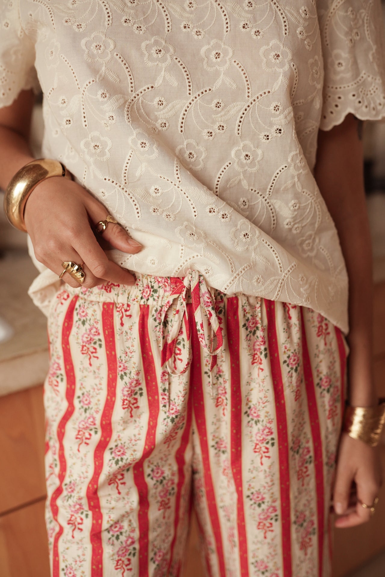 Paolo est un pantalon fluide à l’imprimé floral vertical, rythmé par de fines rayures vertes. Sa taille souple et sa coupe droite dessinent une silhouette légère.