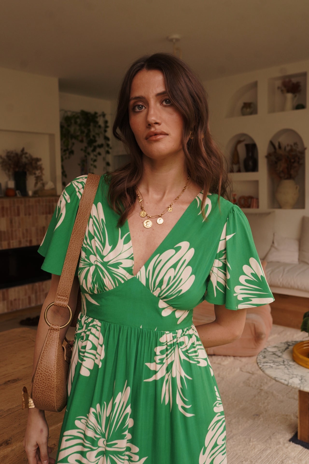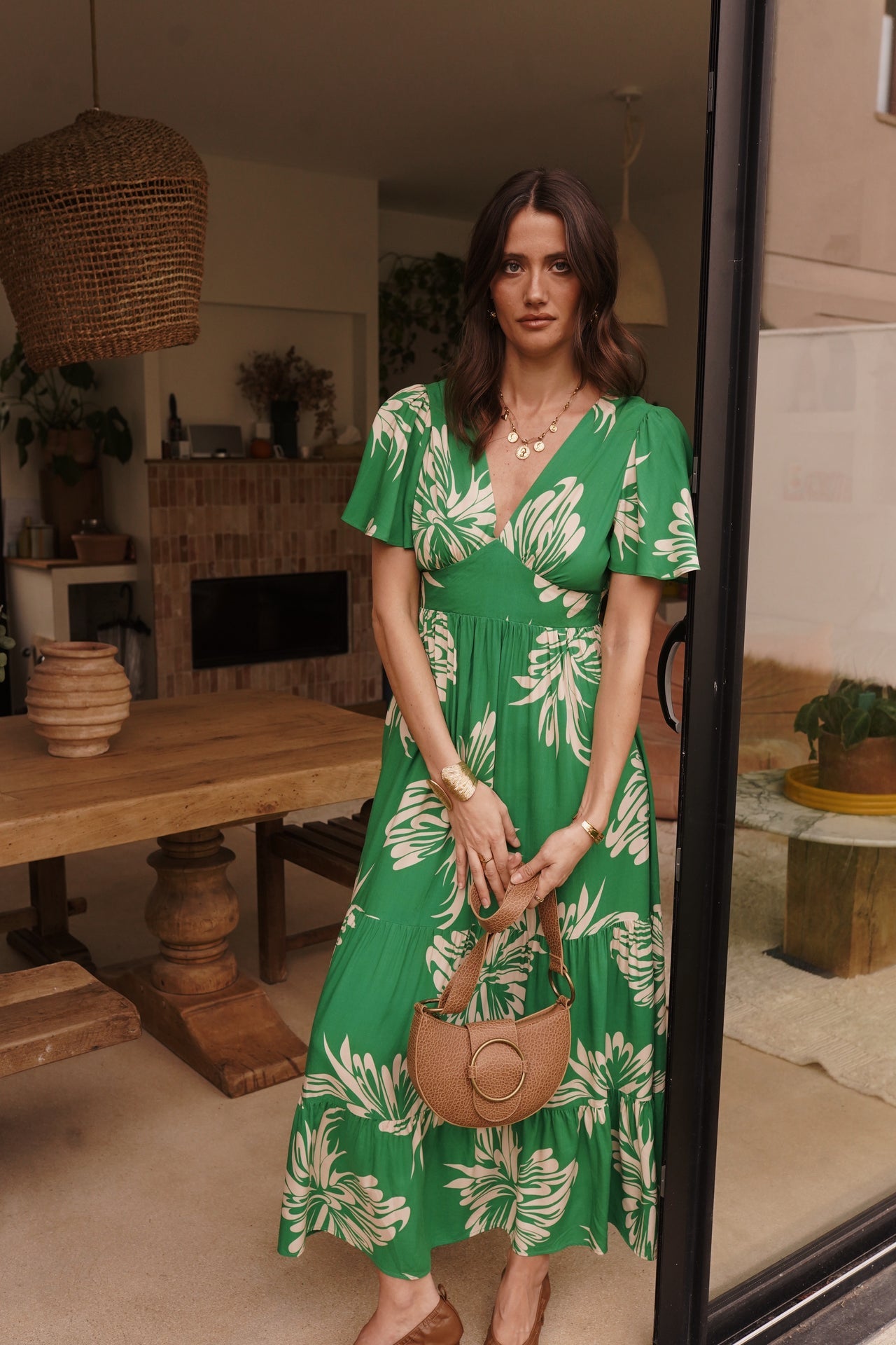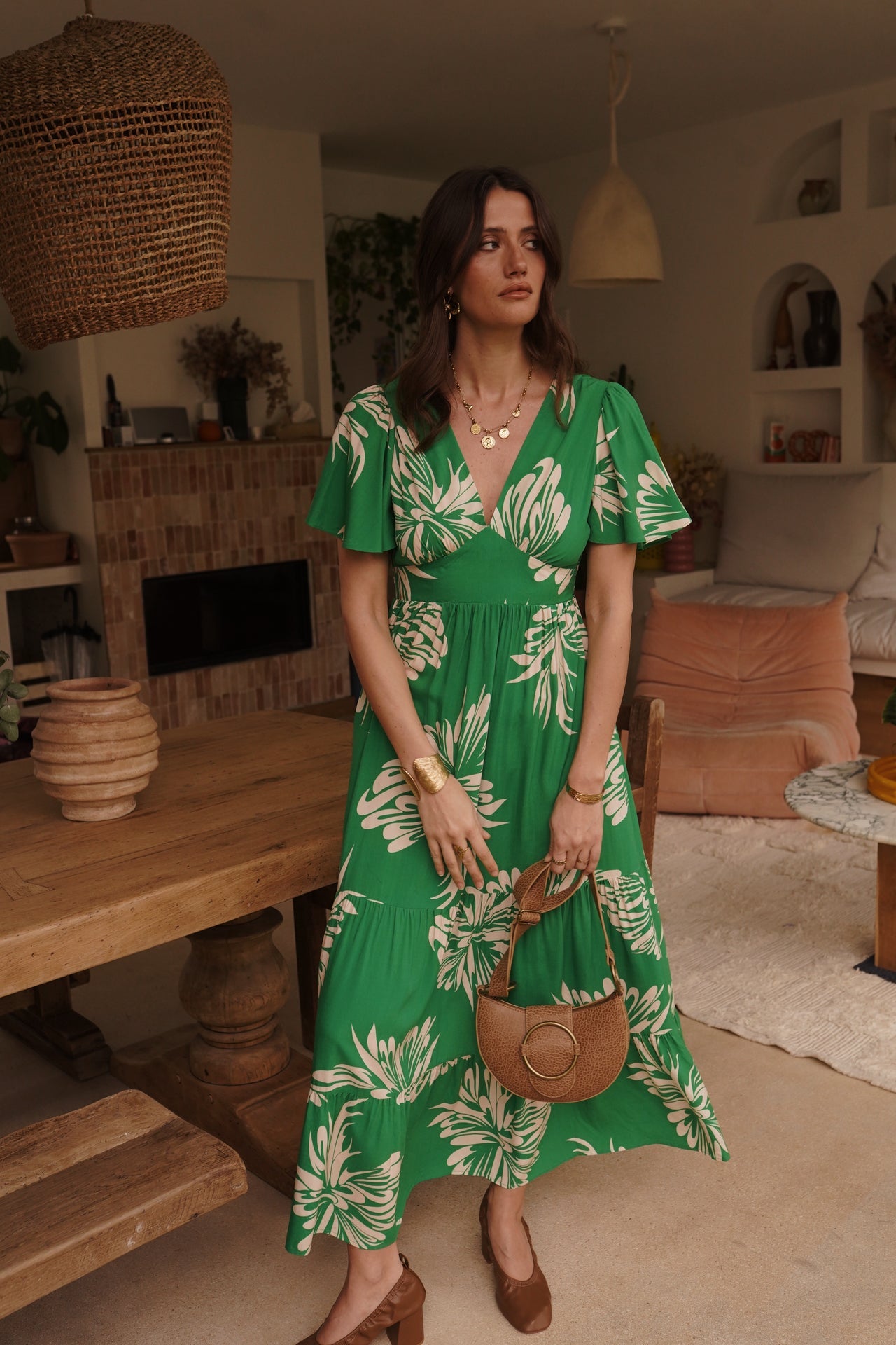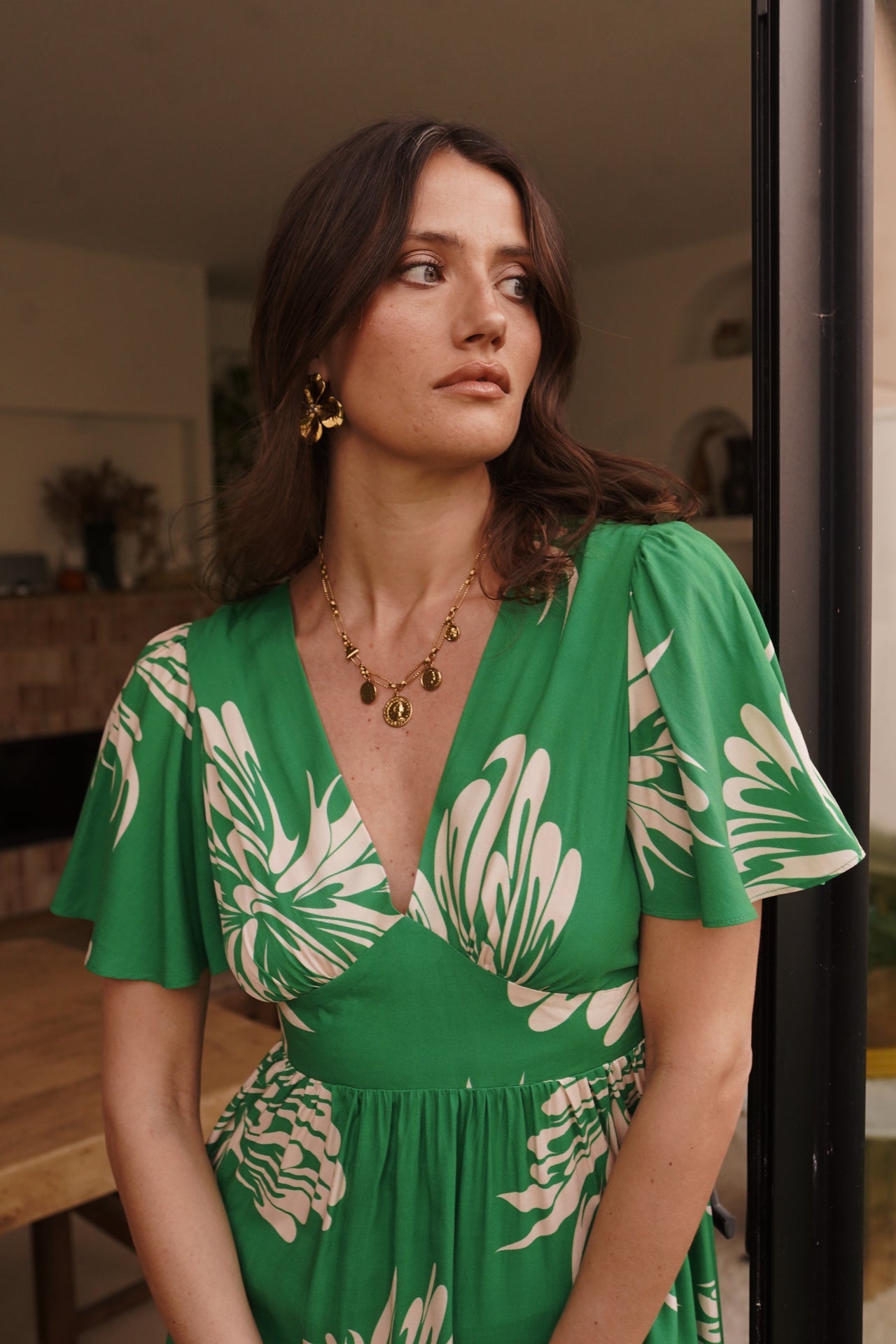 - Coupe midi, manches courtes volantées, décolleté en V et taille marquée
