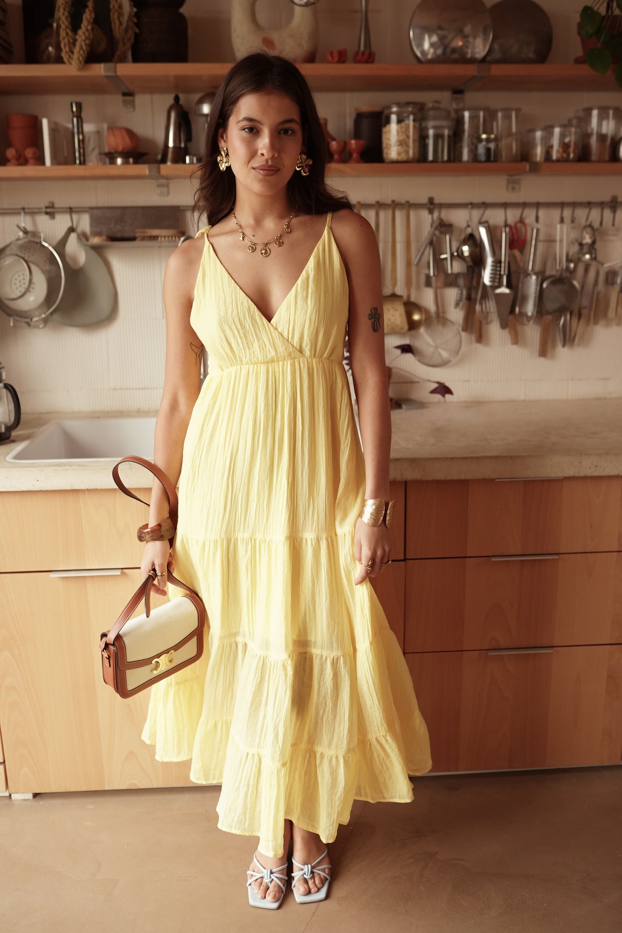 - Coupe longue et évasée, fines bretelles nouées aux épaules et décolleté en V