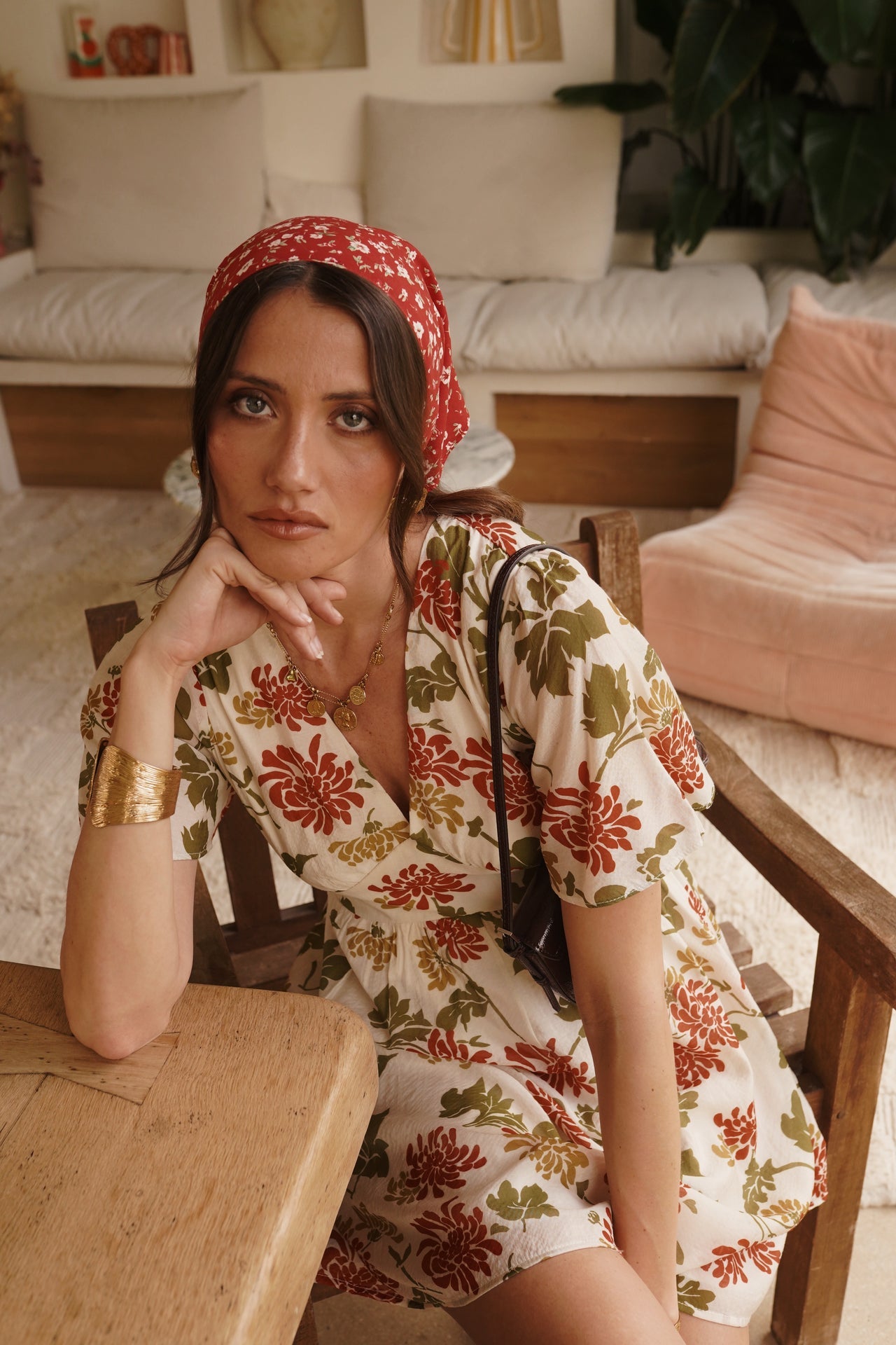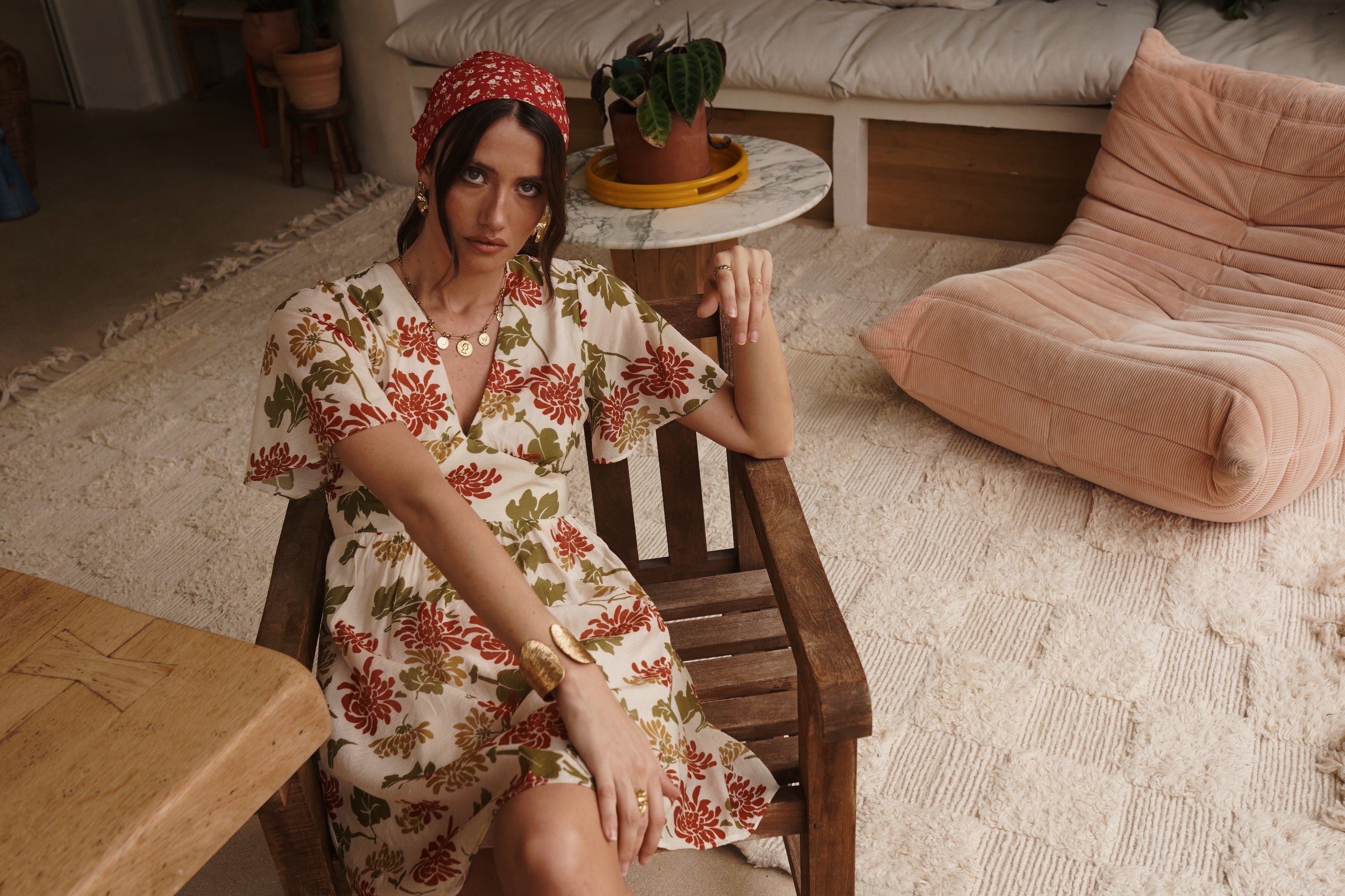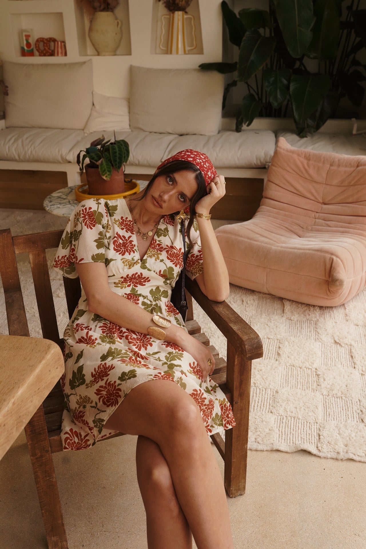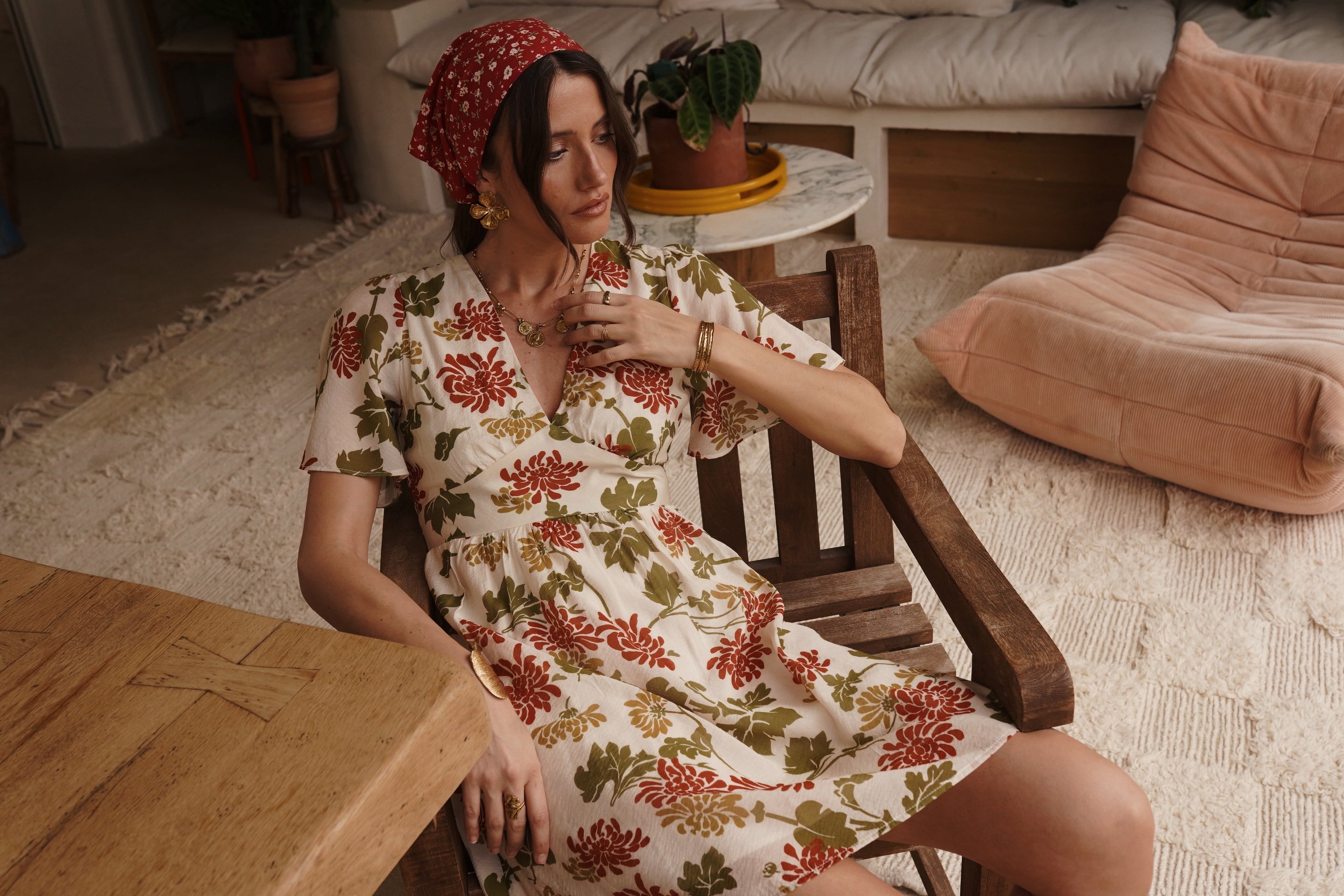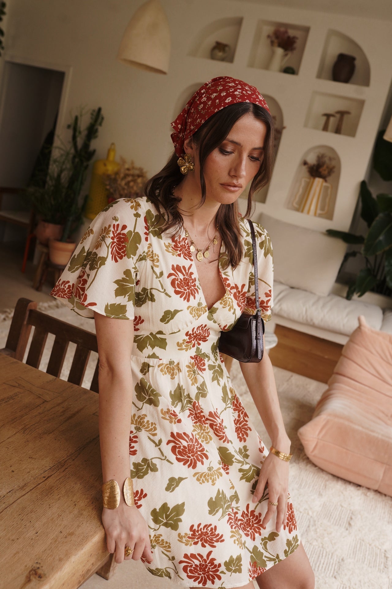 - Imprimé floral aux tons terracotta et vert sur fond écru