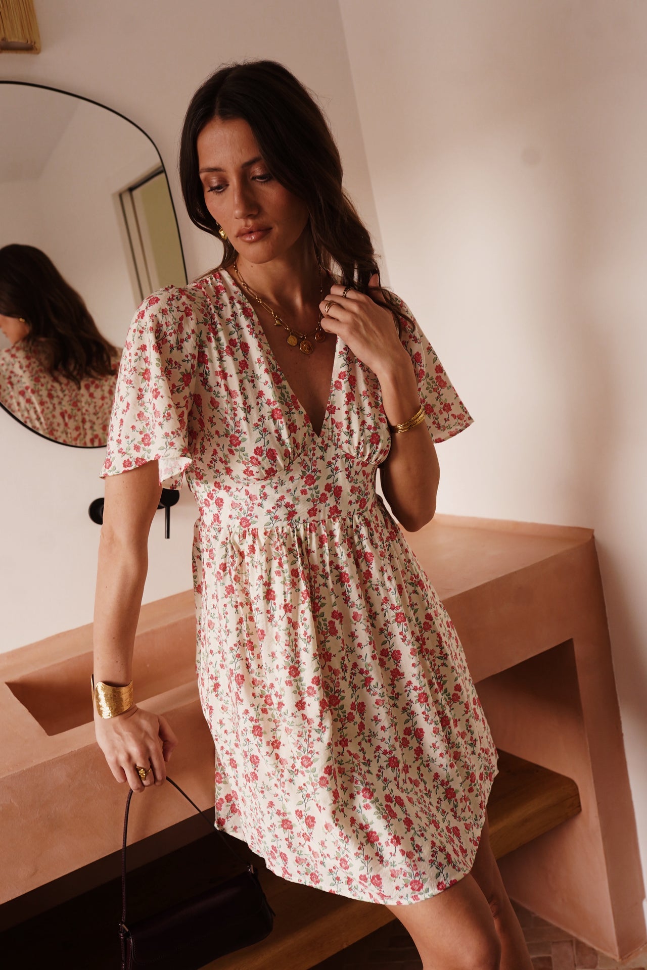 - Coupe courte et évasée, manches courtes, décolleté en V et taille marquée