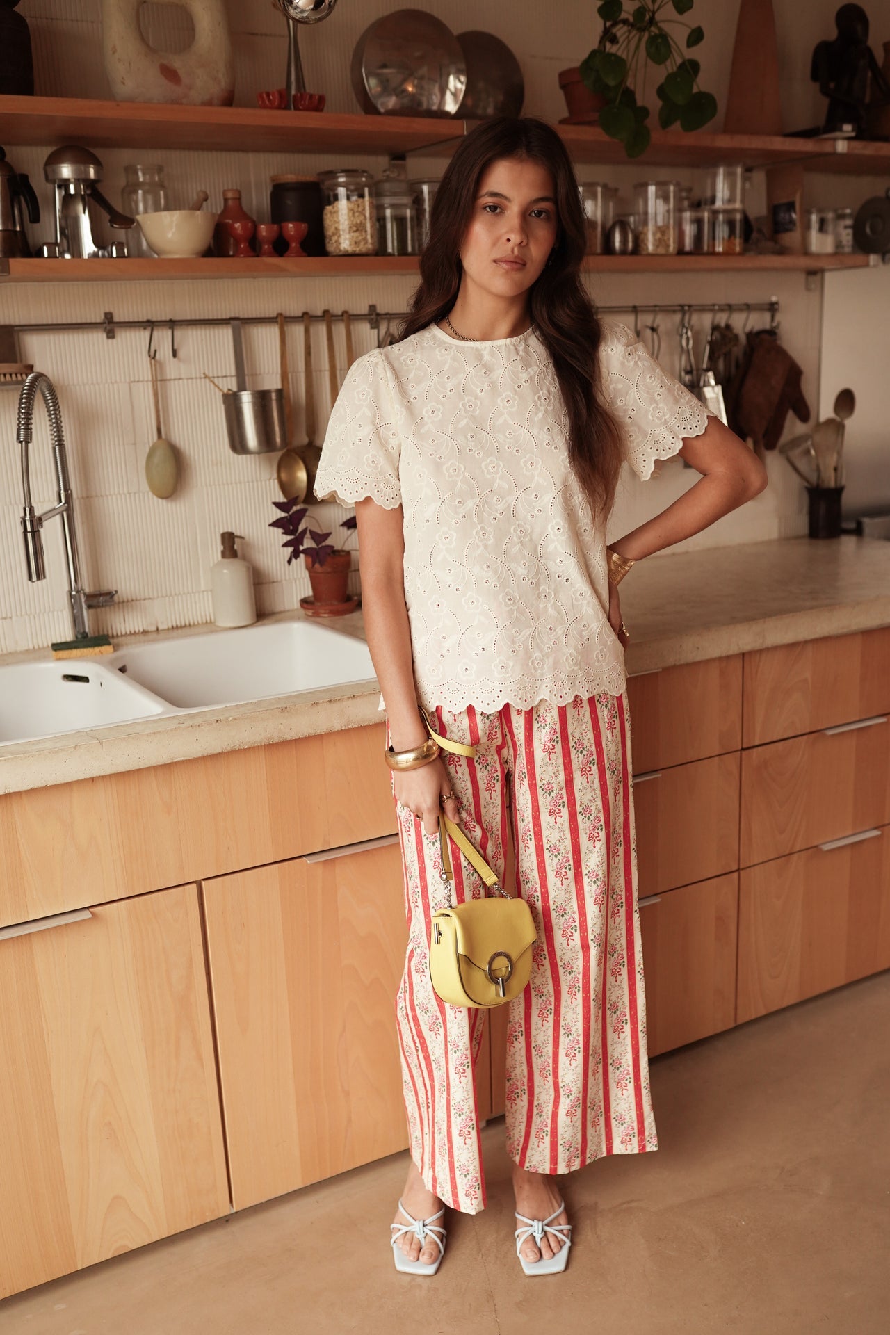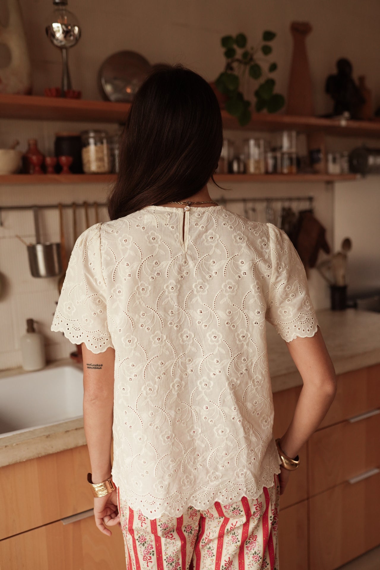 - Coupe droite, manches courtes festonnées et encolure ronde